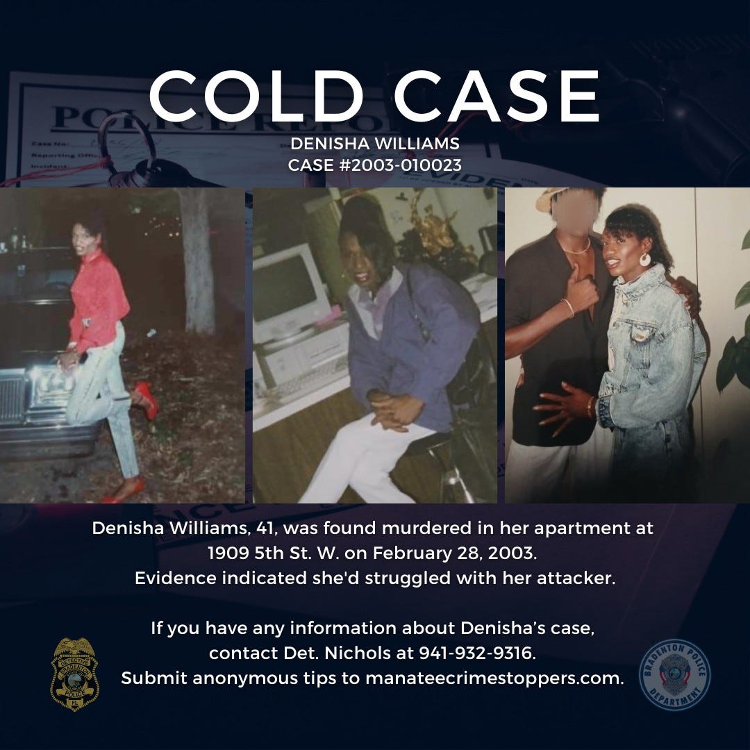 This weekend marked 23 years since Denisha Williams was found murdered inside her apartment at 1909 5th St. W. in Bradenton, a case that remains unsolved more than two decades later.