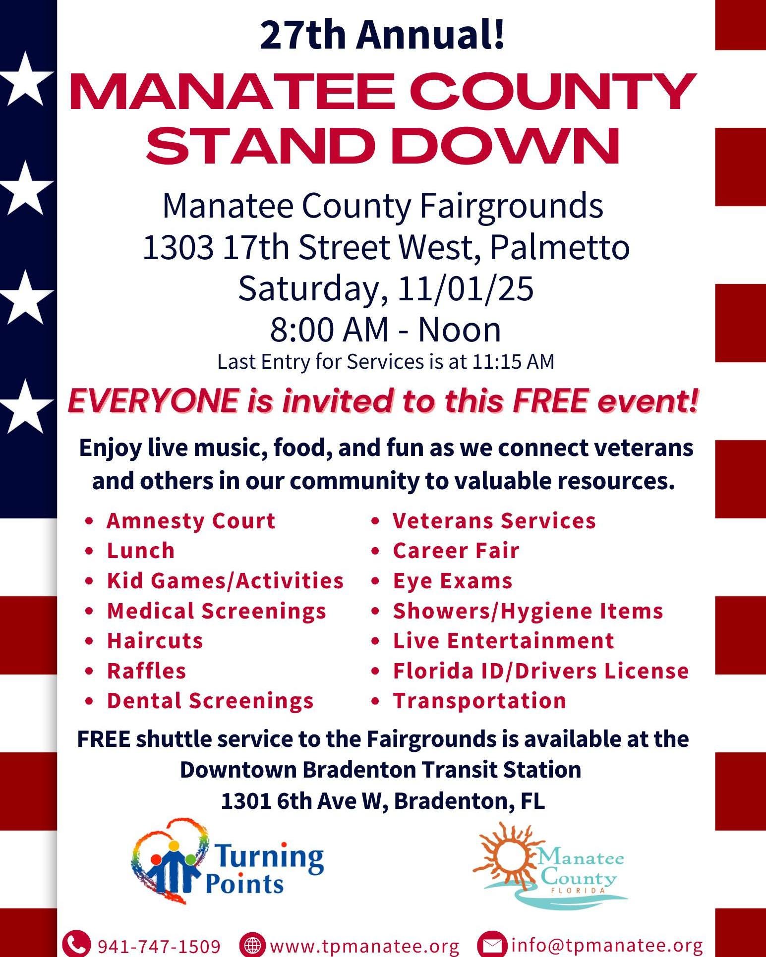 Turning Points will host the 27th Annual Manatee County Stand Down on Saturday, November 1, 2025, from 8:00 a.m. to noon at the Manatee County Fairgrounds, 1303 17th Street West in Palmetto.