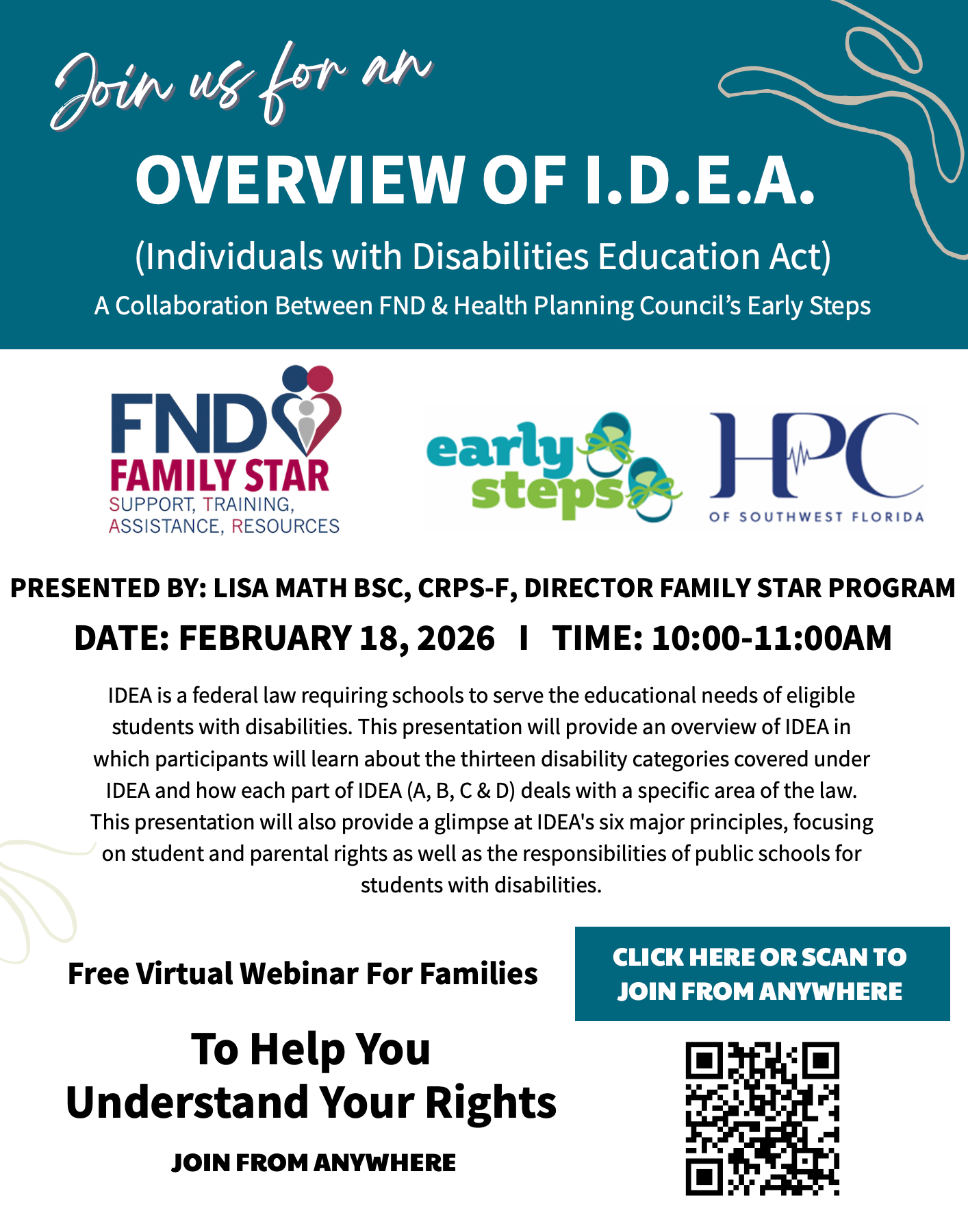 Families across Manatee County can log in on Wednesday, February 18, from 10 to 11 a.m. for a free virtual Overview of I.D.E.A. webinar. The presentation will provide families with an introduction to the Individuals with Disabilities Education Act, including disability categories, parental rights and school responsibilities. The session is presented by Lisa Math, BSC, CRPS-F, Director of the Family Star Program, and is a collaboration between FND and the Health Planning Council’s Early Steps program.
