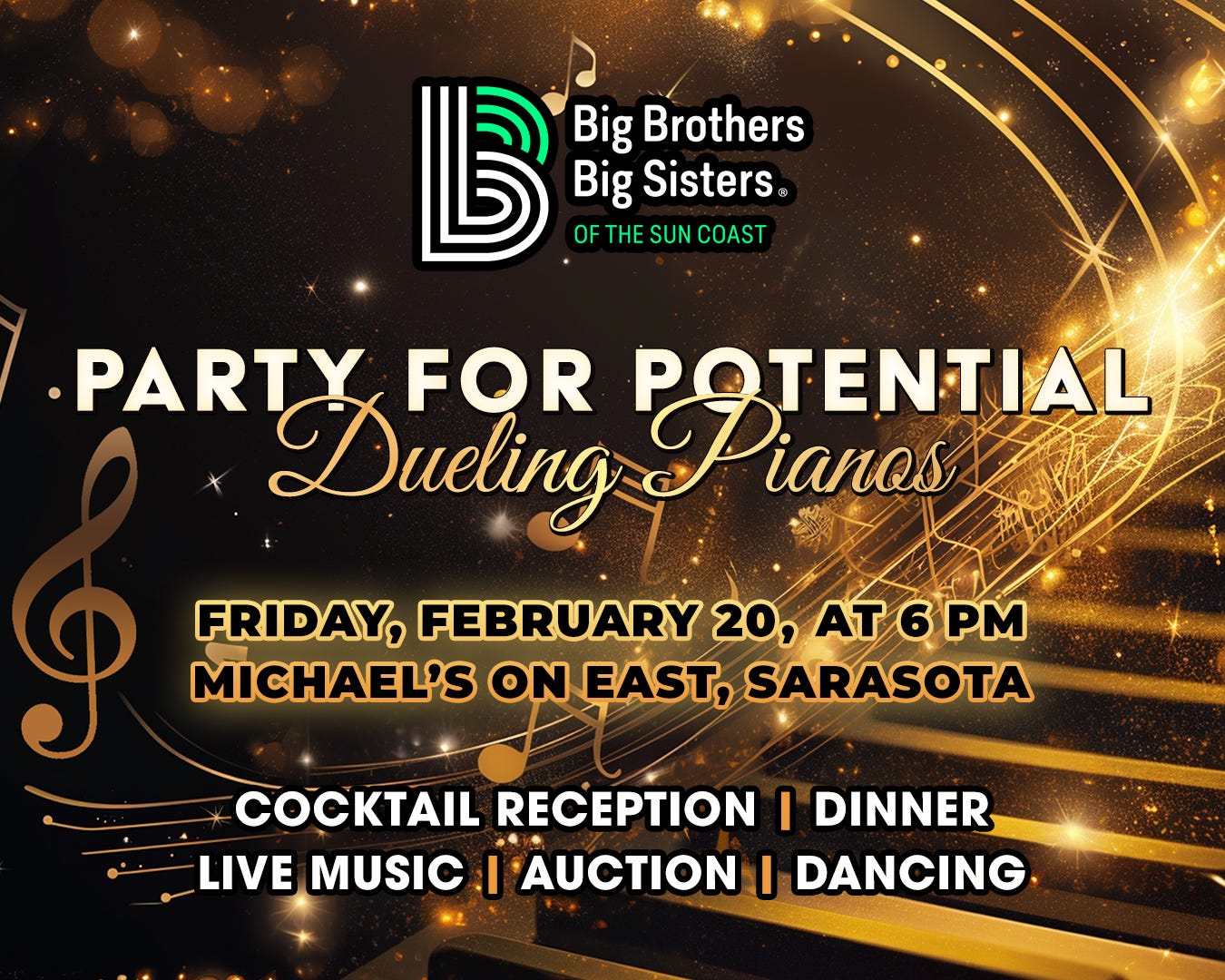 Big Brothers Big Sisters of the Sun Coast will host Party for Potential: Dueling Pianos on Friday, February 20 at Michael’s On East in Sarasota. The evening includes a cocktail reception, dinner, live music, auction and dancing to benefit youth mentoring programs serving the region.