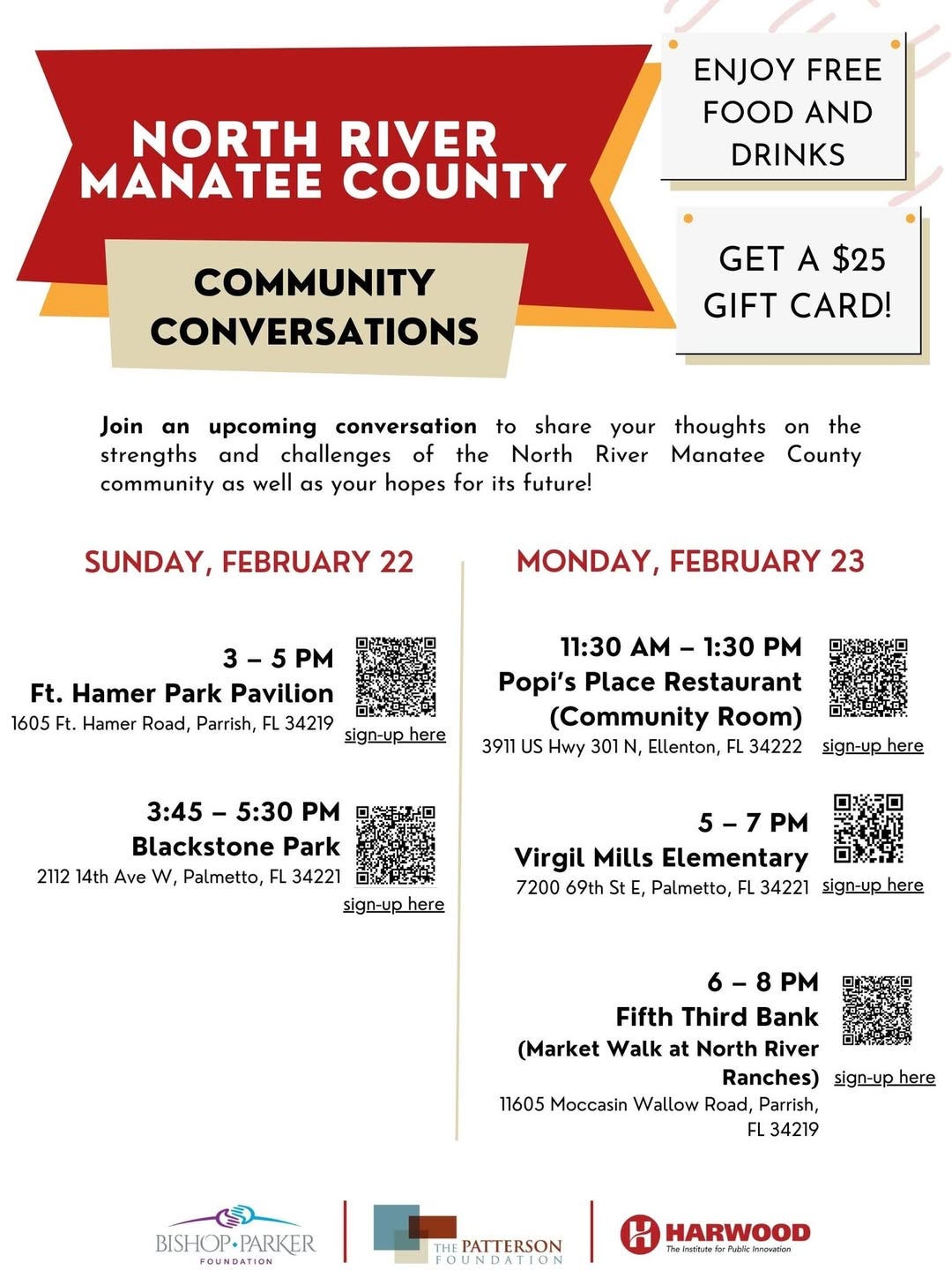 North of the River Manatee County, Community Conversations will be held Sunday, February 22 and Monday, February 23 at multiple locations including Ft. Hamer Park Pavilion, Blackstone Park, Popi’s Place Restaurant in Ellenton, Virgil Mills Elementary and Fifth Third Bank at Market Walk in North River Ranches. Residents are invited to share feedback on the area’s strengths, challenges and future priorities. Participants can enjoy complimentary food and drinks and receive a $25 gift card for attending.