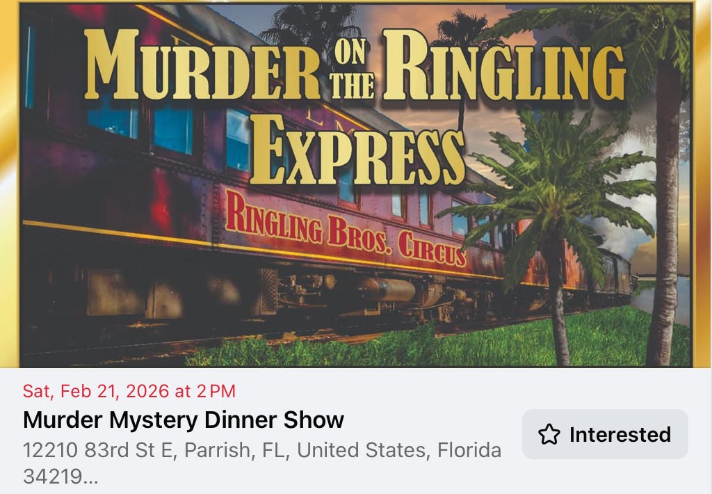 Mystery enthusiasts can attend the Murder Mystery Dinner Show on Saturday, February 21 at 2 p.m. in Parrish, featuring an interactive theatrical dining experience set aboard the Ringling Express.