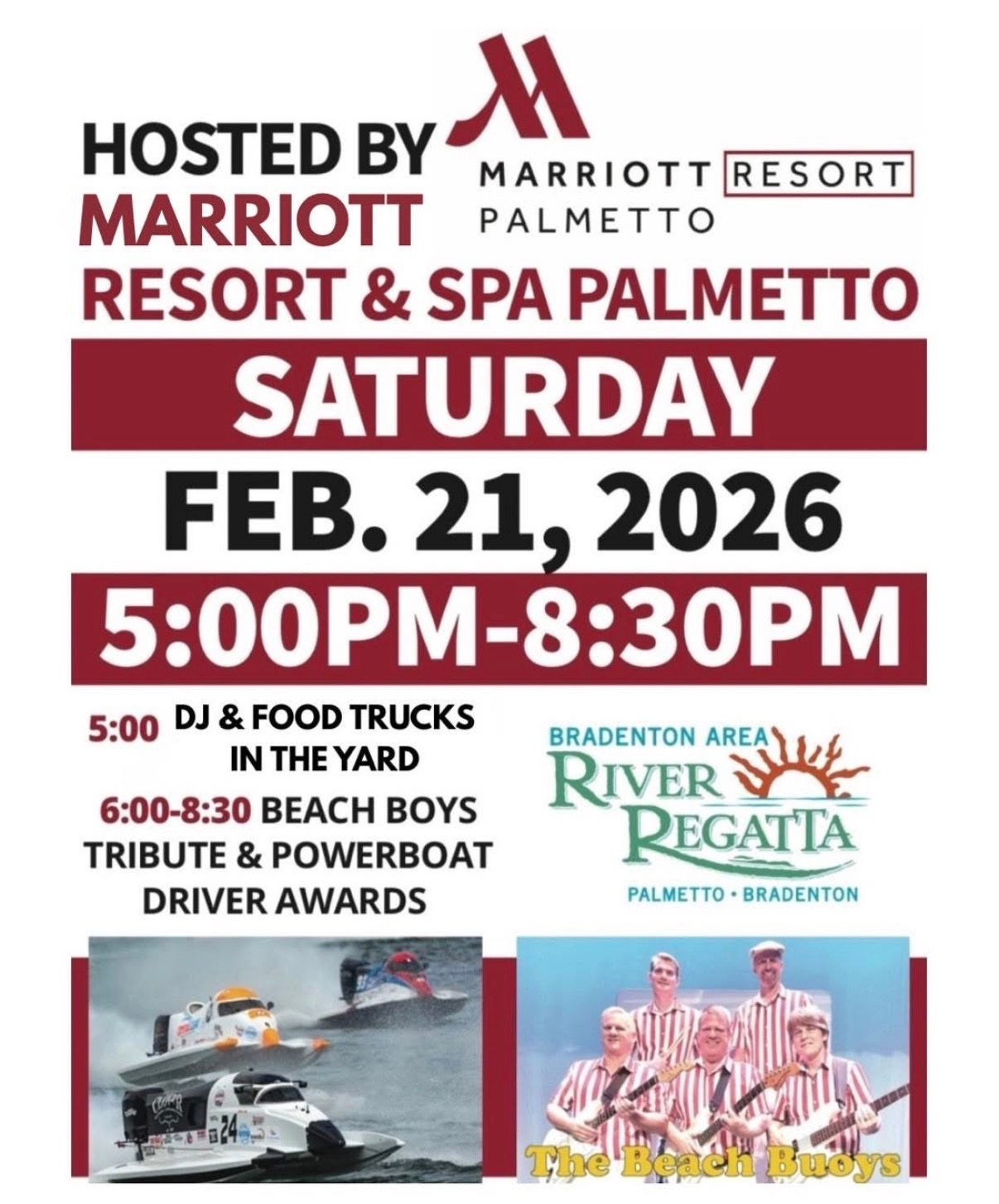 Regatta festivities extend across the Manatee River to Palmetto Riverside Park. In addition, on Saturday, February 21, the Marriott Resort & Spa Palmetto will host an evening celebration beginning at 5 p.m. with a DJ and food trucks, followed by a Beach Boys tribute performance and powerboat driver awards from 6 to 8:30 p.m., complementing the Regatta weekend excitement.