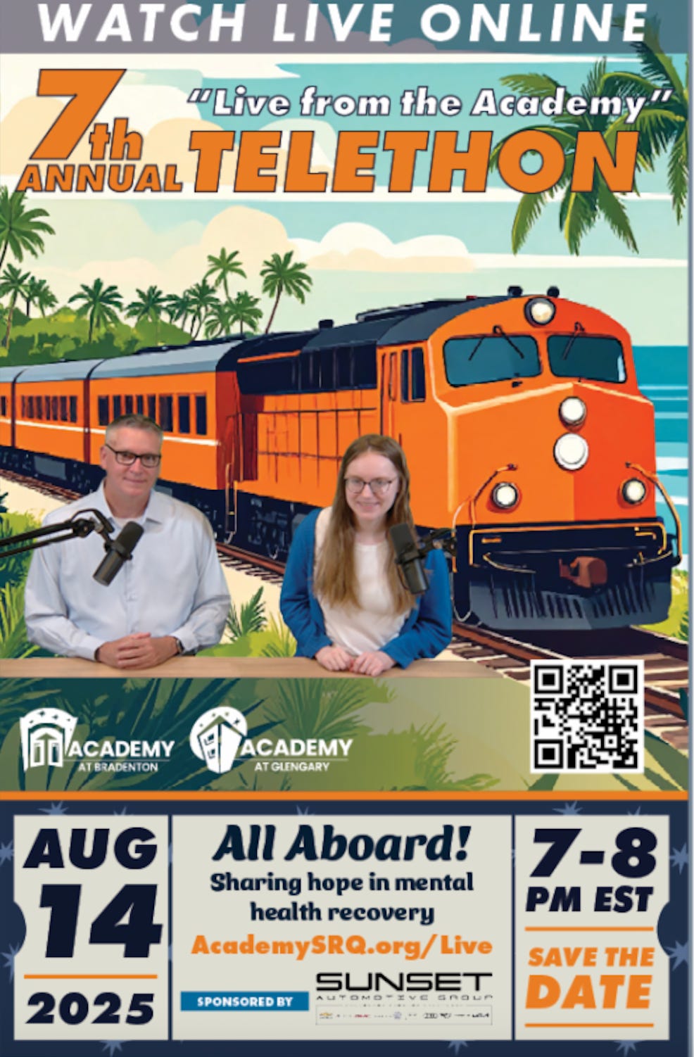 The Academy at Bradenton and its sister location, the Academy at Glengary, are set to go live for their 7th Annual Telethon on Wednesday, August 14, 2025. This year’s theme, “All Aboard! Sharing Hope in Mental Health Recovery,” invites viewers to tune in from 7 to 8 PM EST for a powerful hour of storytelling, community, and impact.