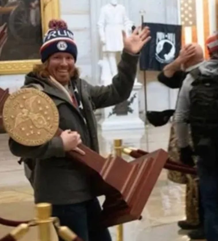 Johnson is widely known beyond Manatee County as “The Lectern Guy,” a nickname stemming from the January 6, 2021, takeover of the United States Capitol in Washington, D.C., where he was photographed carrying a lectern from inside the building. The image circulated nationally and became one of the most recognizable visuals associated with the events of that day.