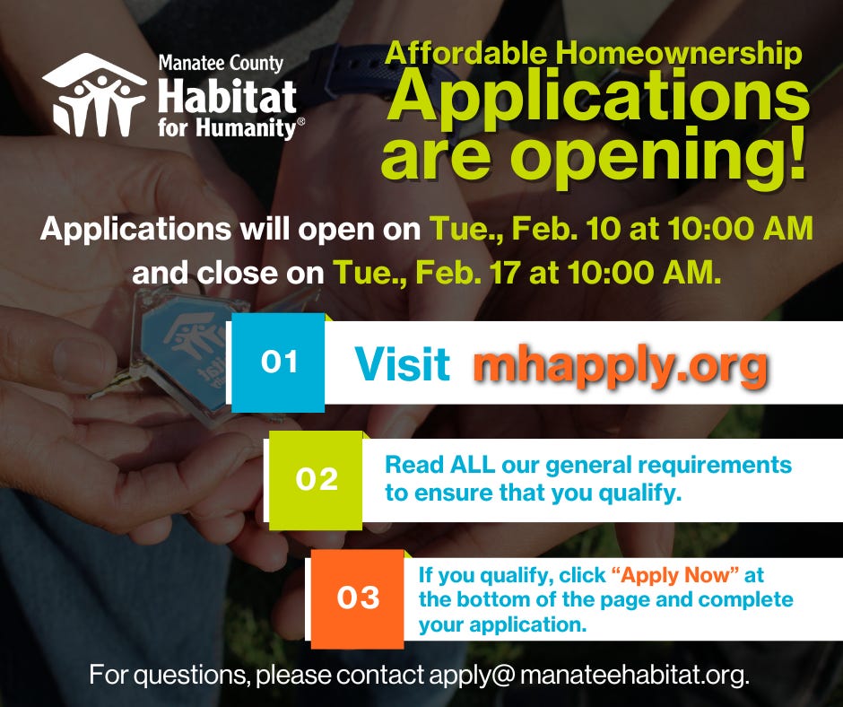 Manatee County Habitat for Humanity will open applications for its affordable homeownership program on Tuesday, February 10, 2026, at 10:00 a.m. The application window will remain open for one week and close on Tuesday, February 17, 2026, at 10:00 a.m.