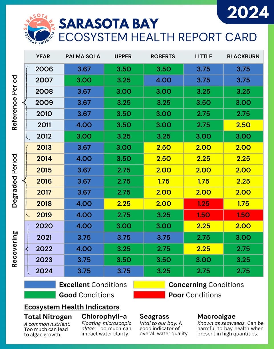 According to long-term monitoring data, the overall health of Palma Sola Bay has consistently been rated in the good to excellent range for nearly 20 years. The latest update highlighted both areas of progress and the need for continued collaboration to safeguard water quality for residents, visitors, and local wildlife.