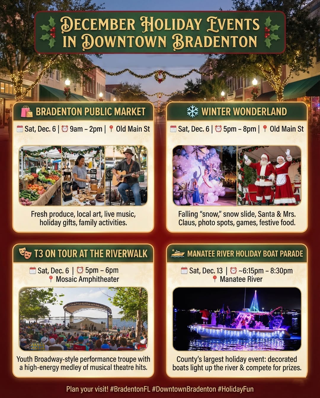 The month begins on Saturday, December 6, with the Bradenton Public Market from 9 a.m. to 2 p.m. on Old Main Street. Shoppers can browse fresh produce, handmade goods, local art, and sample treats from small businesses while enjoying live music. The market offers an ideal place to find unique holiday gifts and seasonal favorites.