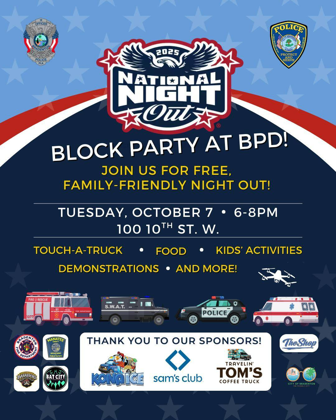 The Bradenton Police Department will welcome the community to its headquarters on Tuesday, October 7, for a National Night Out block party. The free event, running from 6 to 8 p.m. at 100 10th Street West, offers a family-friendly evening filled with activities, demonstrations, and food.