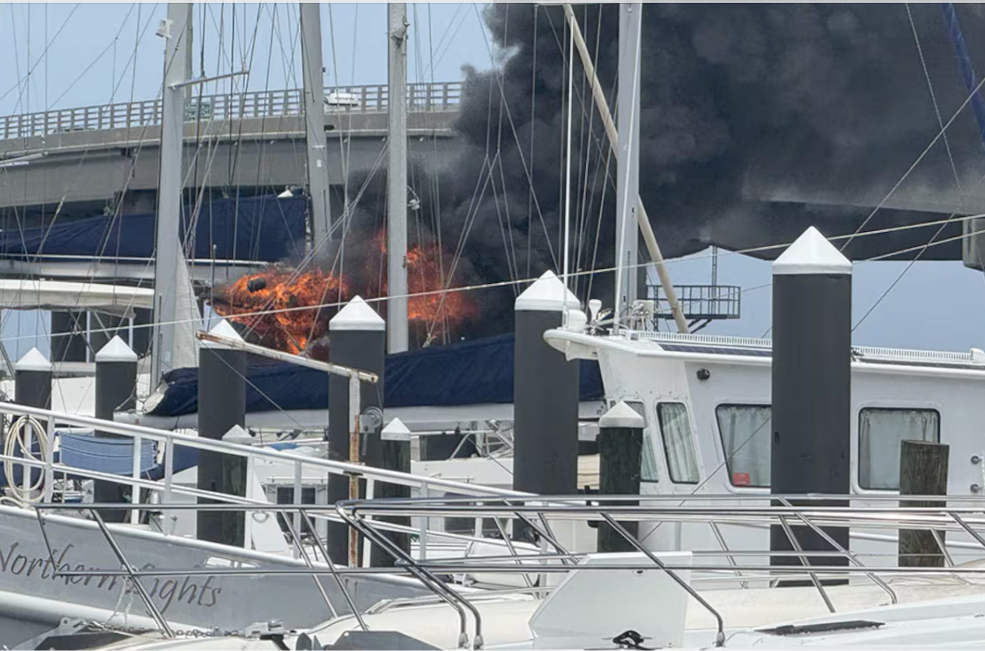 The blaze was reported around 1:30 p.m., prompting a swift emergency response to the popular downtown marina. The fire engulfed at least one vessel docked at the marina, with smoke visible from surrounding areas along the Manatee River.