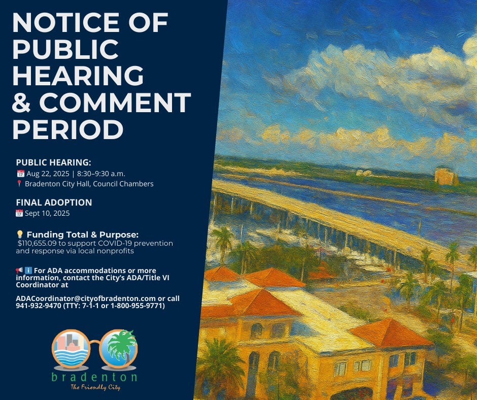 The public comment period runs from August 10 through September 10, 2025. A public hearing is scheduled for August 22 from 8:30 to 9:30 a.m. at Bradenton City Hall in the Council Chambers. The City Commission is expected to consider final adoption on September 10, 2025.