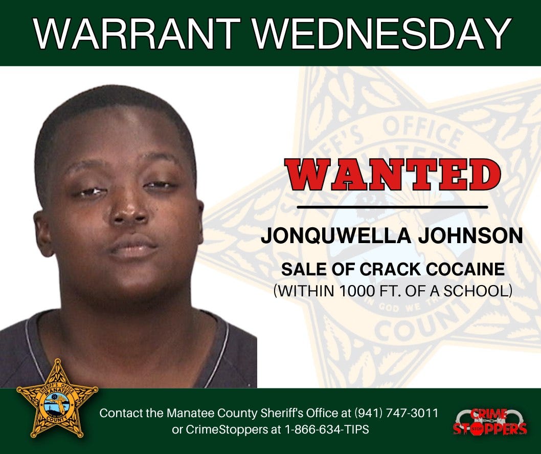Authorities are searching for Jonquwella Johnson, who is wanted for selling crack cocaine within 1,000 feet of a school. Law enforcement is urging the public to report any information regarding her whereabouts by calling the Manatee County Sheriff’s Office (941) 747-3011 or CrimeStoppers of Manatee County at 1-866-634-TIPS.