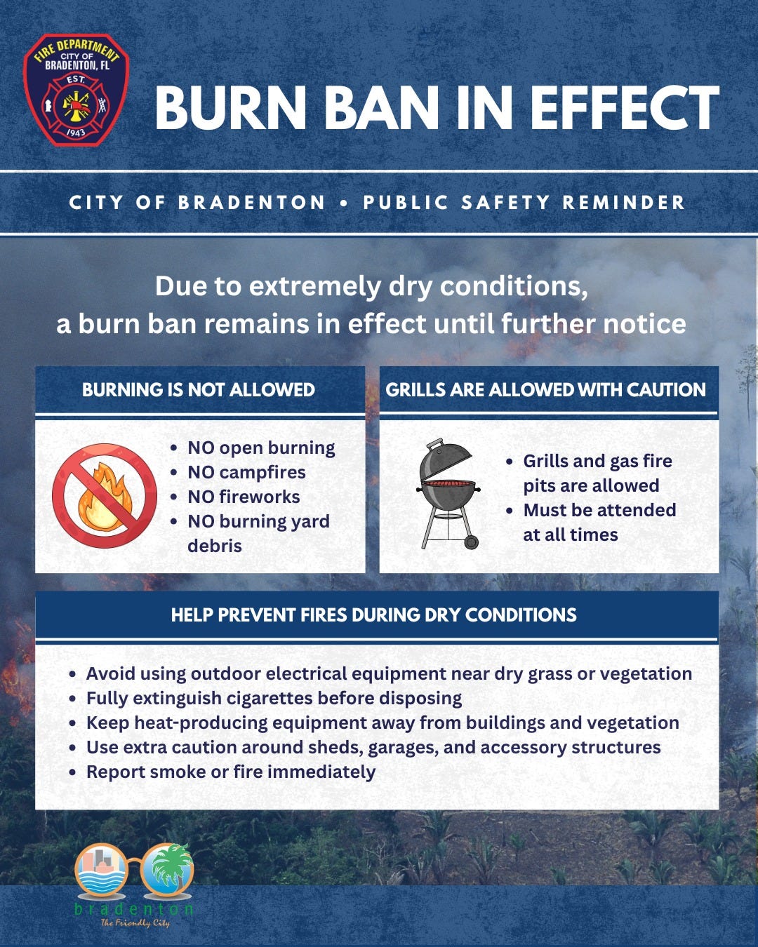 Manatee County officials are reminding residents that the burn ban remains in effect countywide, including within the City of Bradenton, as dry and windy conditions continue to elevate the risk of wildfire.