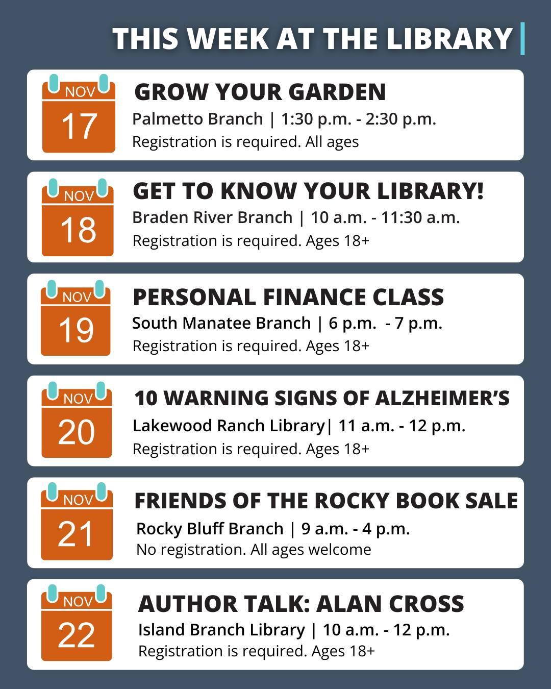 The Manatee County Public Library System is offering daily programs throughout the week. On November 17, the Palmetto Branch will host Grow Your Garden from 1:30 to 2:30 p.m., welcoming all ages with required registration. The next morning, November 18, the Braden River Branch invites adults to "Get to Know Your Library" from 10:00 to 11:30 a.m. A personal finance class for adults is scheduled at the South Manatee Branch on November 19 from 6 to 7 p.m., followed by a health-focused seminar, 10 Warning Signs of Alzheimer’s, at the Lakewood Ranch Library on November 20 from 11 a.m. to noon. The Rocky Bluff Branch will hold its Friends of the Rocky Book Sale on November 21 from 9 a.m. to 4 p.m., and the week concludes with an author talk featuring Alan Cross at the Island Branch Library on November 22 from 10 a.m. to noon.