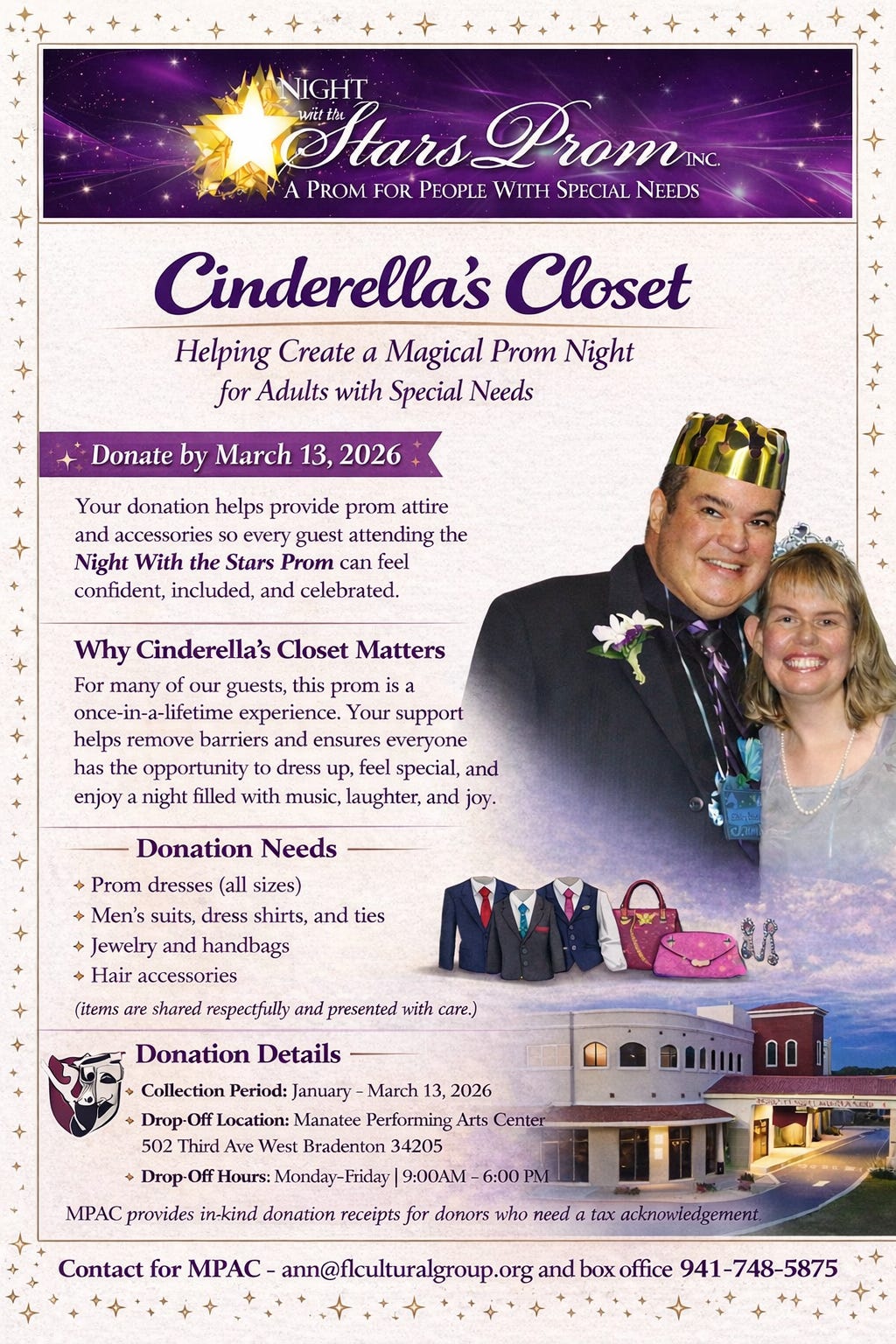 Community members are encouraged to participate by donating gently used or new formalwear and accessories to help make prom night unforgettable for every guest. For additional information, contact the Manatee Performing Arts Center box office at 941-748-5875 or via email at ann@flculturalgroup.org.