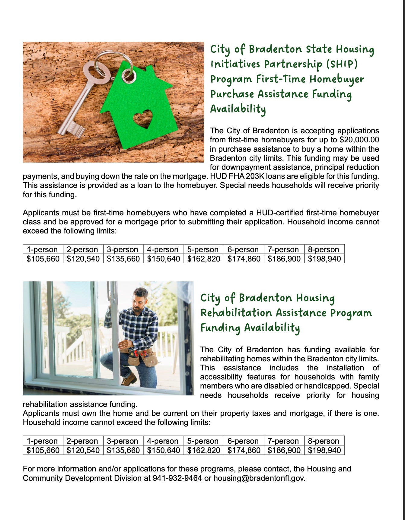 Both programs are administered through the City of Bradenton’s Housing and Community Development Division. Residents interested in applying or seeking additional information can contact the division directly at 941-932-9464 or by email at housing@bradentonfl.gov.