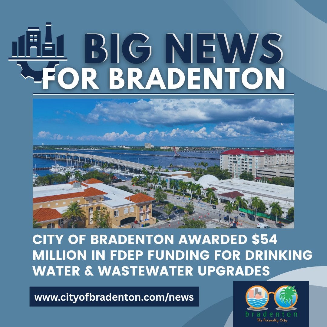 The City of Bradenton has been awarded more than $54 million in funding from the Florida Department of Environmental Protection to support significant improvements to its drinking water and wastewater systems.