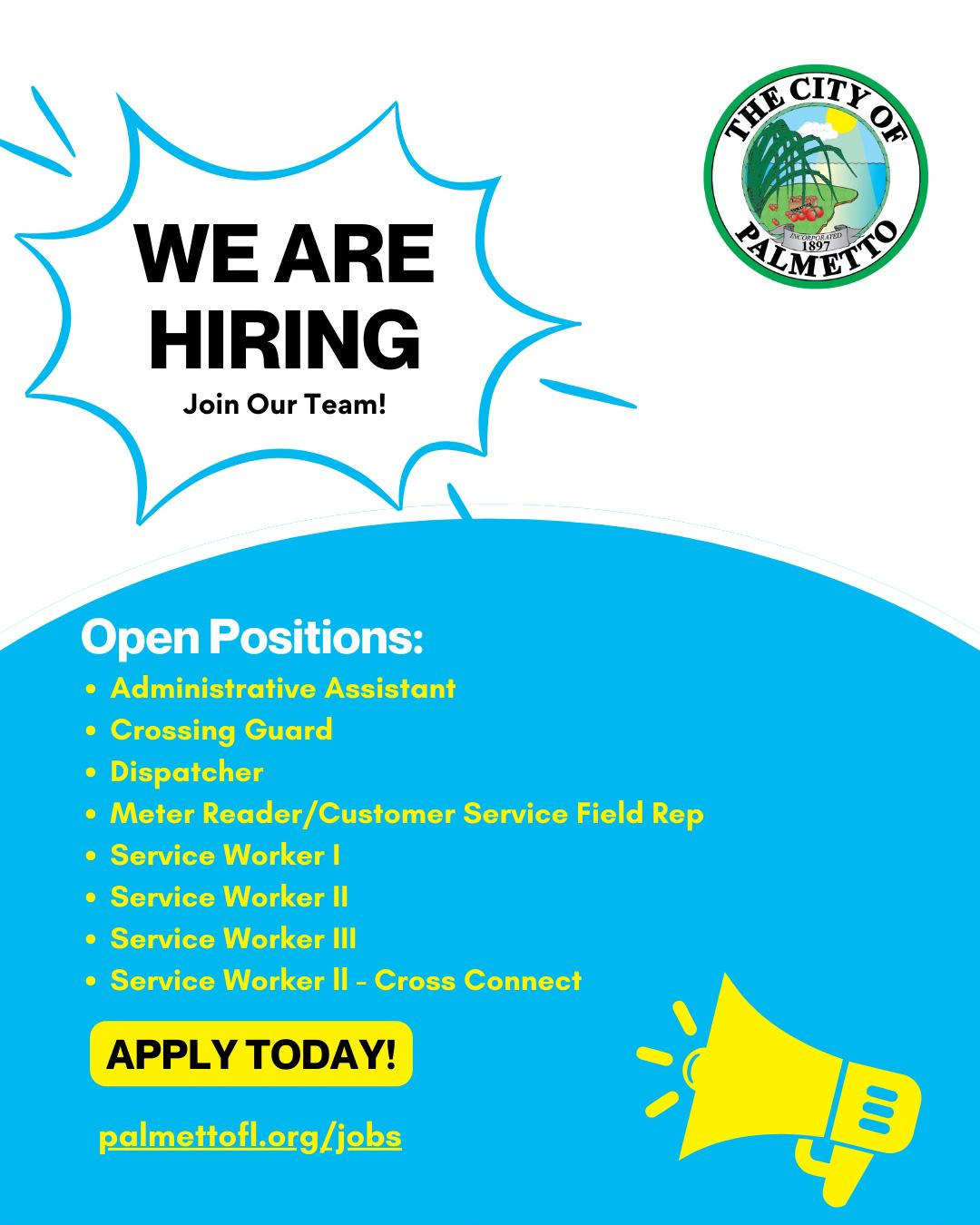 The City of Palmetto is seeking to fill several open positions across multiple departments, offering residents an opportunity to join the municipal workforce and support essential community services.