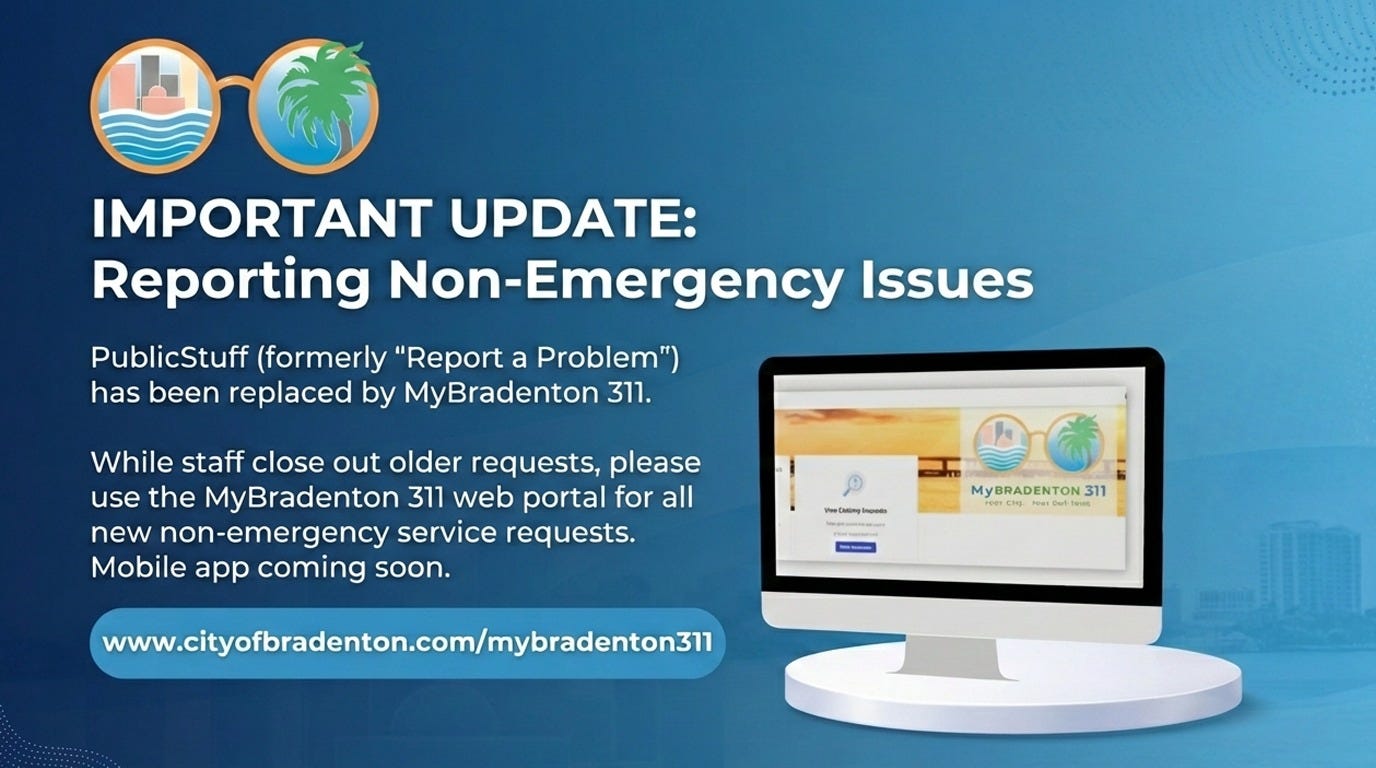 Residents reporting non-emergency issues are being directed to a new platform while the City of Bradenton completes its transition from PublicStuff (formerly Report a Problem) to MyBradenton 311.