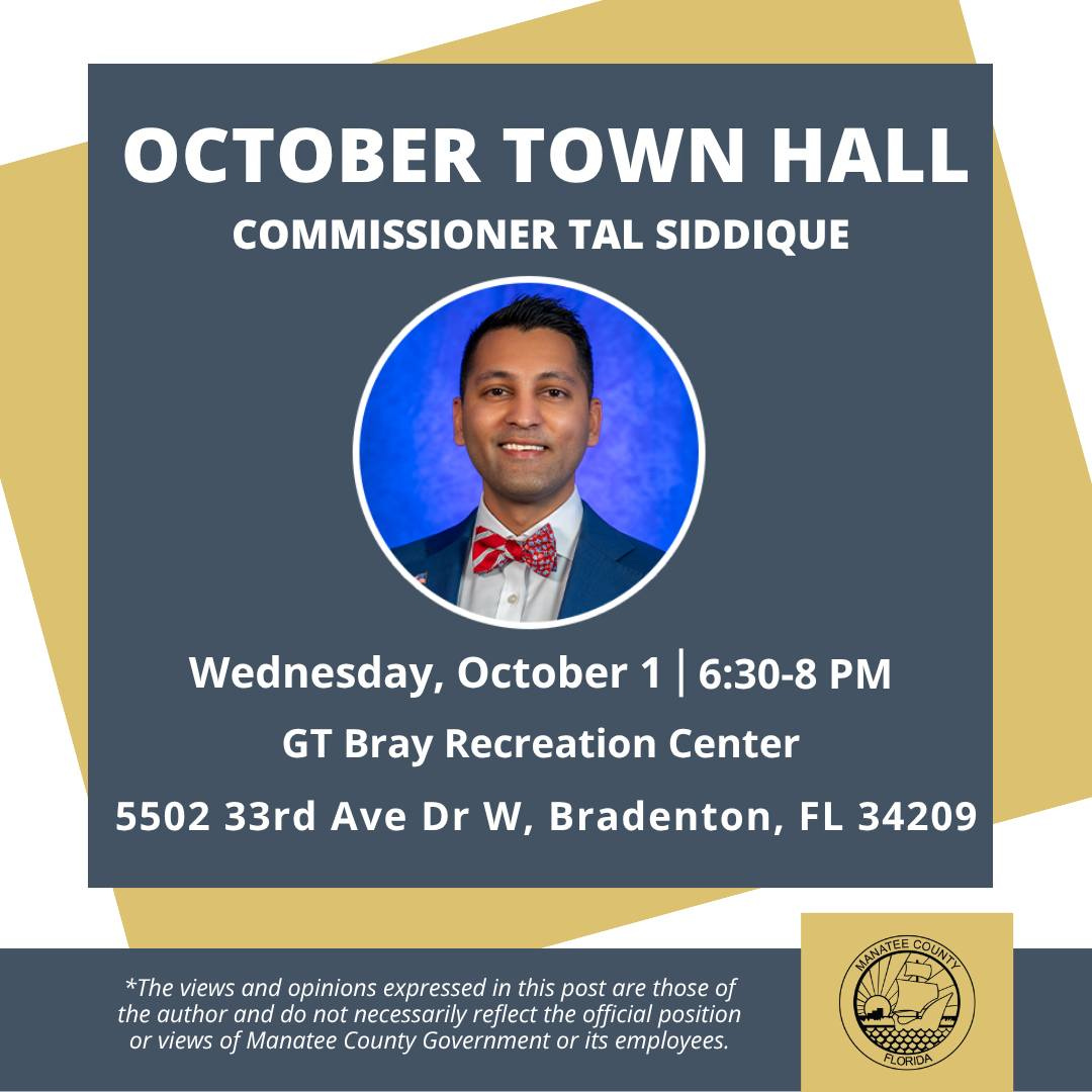 Manatee County Commissioner Tal Siddique, who represents District 3, will hold a community Town Hall on Wednesday, October 1, from 6:30 to 8 p.m. at the GT Bray Recreation Center, located at 5502 33rd Avenue Drive West in Bradenton.