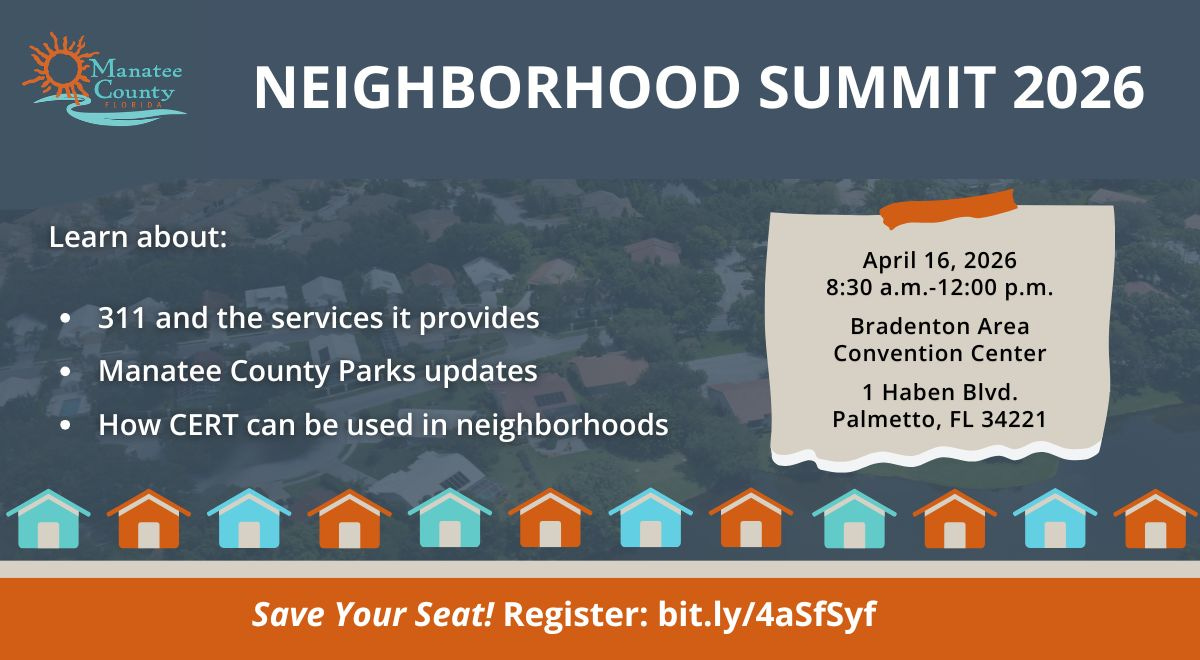 On April 16, the Manatee County Neighborhood Summit will take place from 8:30 a.m. to noon at the Bradenton Area Convention Center in Palmetto. The event will provide updates on county services, including 311 operations, park improvements, and Community Emergency Response Team programs.