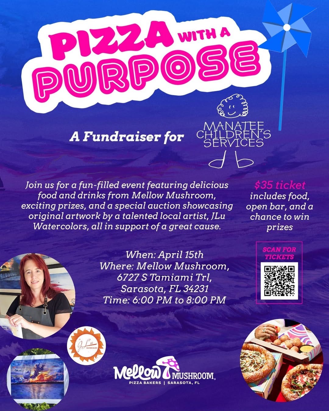A fundraiser supporting Manatee Children’s Services, Pizza with a Purpose, will take place on April 15 from 6 p.m. to 8 p.m. at Mellow Mushroom in Sarasota, featuring food, drinks, prizes, and a local art auction.