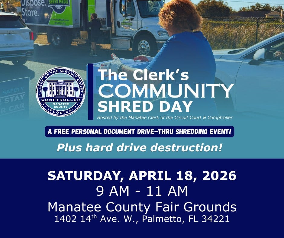 On April 18, the Manatee County Clerk of the Circuit Court & Comptroller will host a free Community Shred Day at the Manatee County Fairgrounds in Palmetto from 9 a.m. to 11 a.m., offering secure document shredding and hard drive destruction.