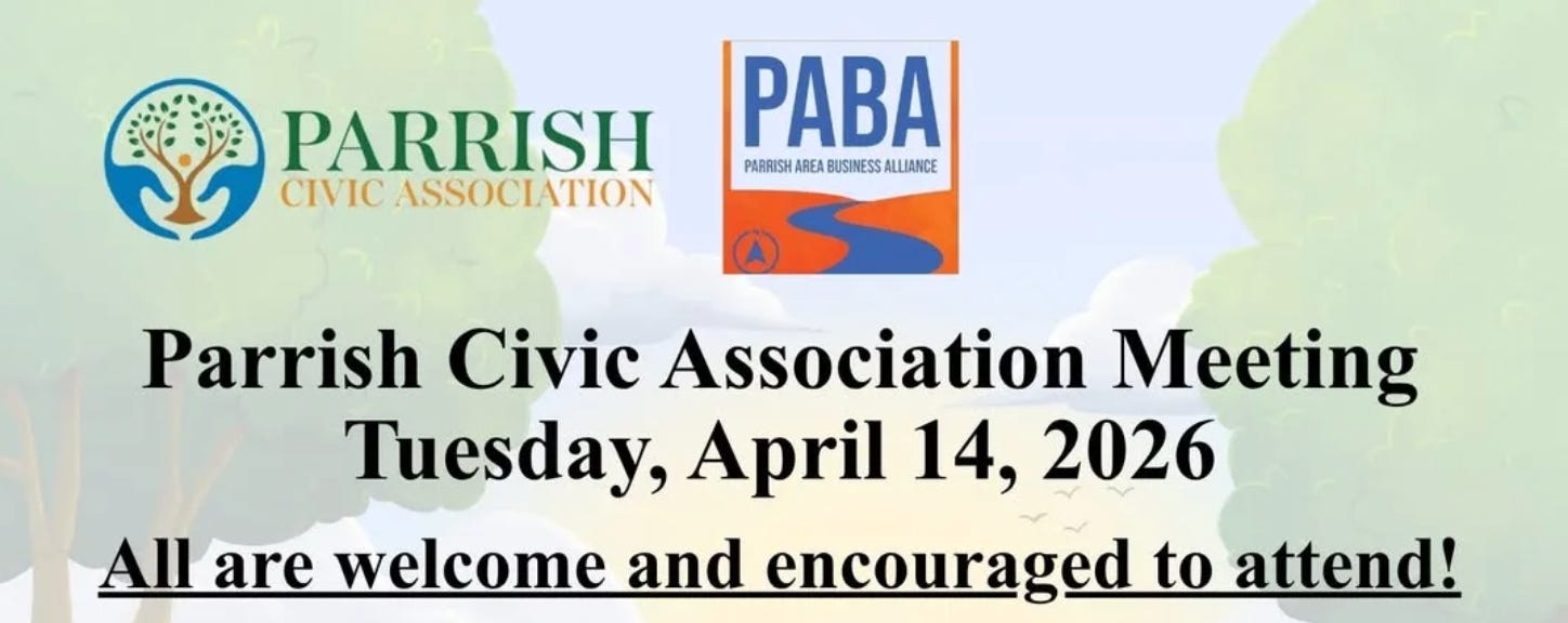 Civic engagement opportunities begin April 14 with the Parrish Civic Association meeting at Parrish Community High School, featuring a public forum and guest speaker focused on local issues and the District 1 commission race.