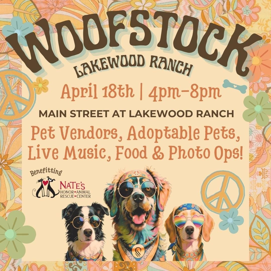 In Lakewood Ranch, Woofstock returns April 18 from 4 p.m. to 8 p.m. on Main Street, combining live music, pet adoptions, vendors, and family-friendly activities benefiting Nate’s Honor Animal Rescue.