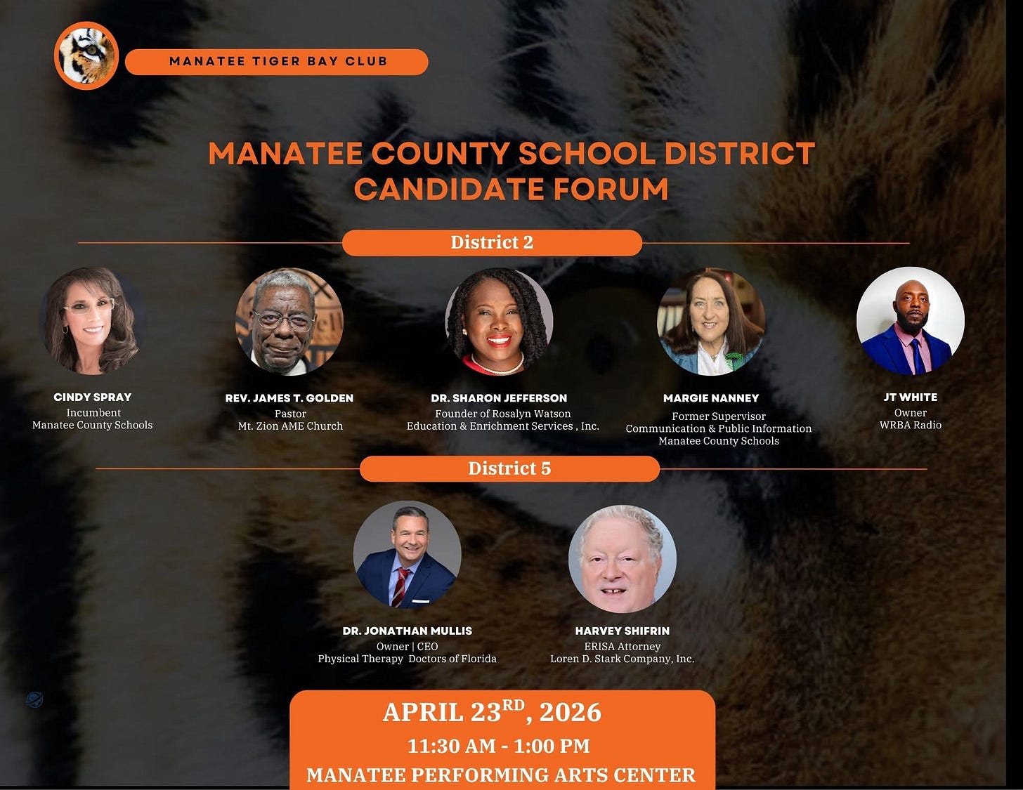 On April 23, several events are scheduled throughout the county. The Manatee Tiger Bay Club will host a School District Candidate Forum at the Manatee Performing Arts Center from 11:30 a.m. to 1 p.m., giving residents the opportunity to hear from candidates in Districts 2 and 5 ahead of upcoming elections.