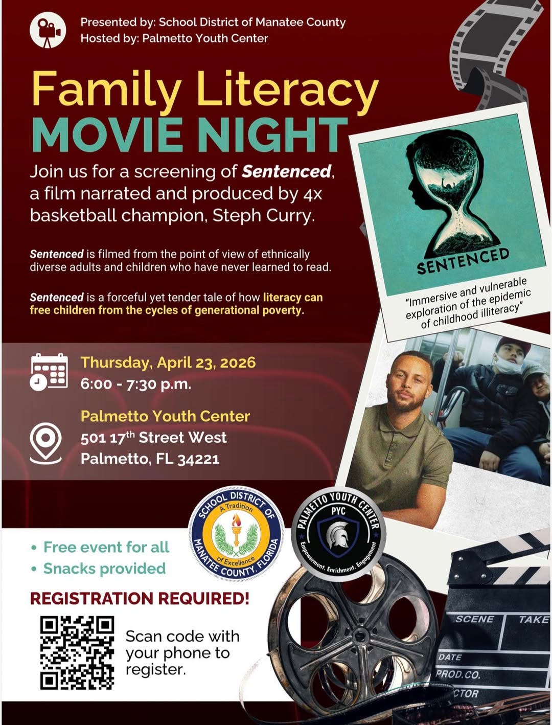 That evening, the Palmetto Youth Center will host a Family Literacy Movie Night from 6:00 p.m. to 7:30 p.m., featuring a screening of Sentenced, a film focused on the impact of literacy and its role in breaking cycles of poverty.