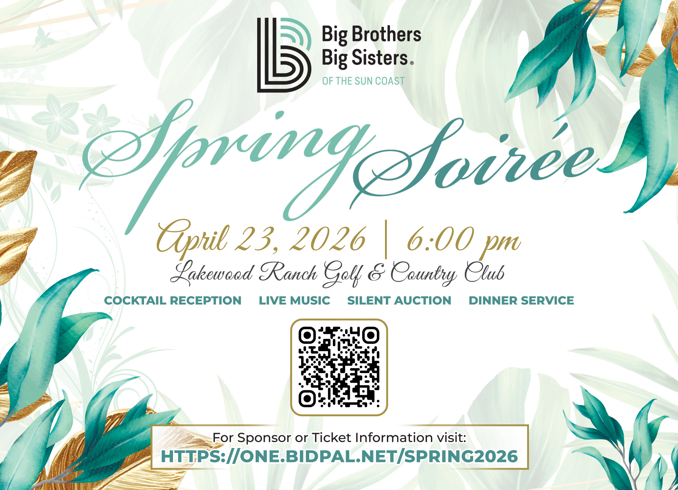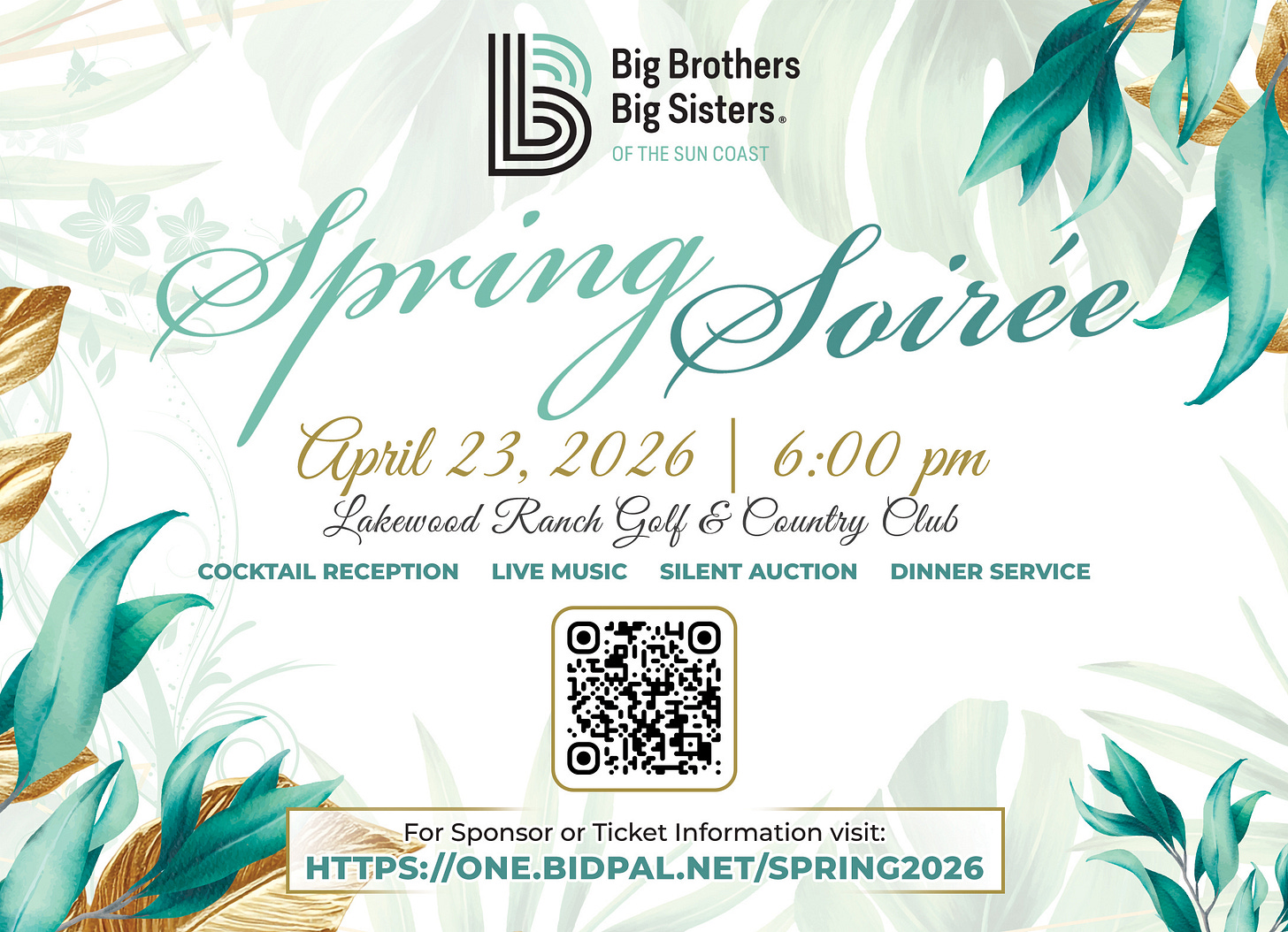 Also on April 23, Big Brothers Big Sisters of the Sun Coast will hold its Spring Soirée at Lakewood Ranch Golf & Country Club beginning at 6:00 p.m., featuring a cocktail reception, live music, silent auction, and dinner service to support mentoring programs.