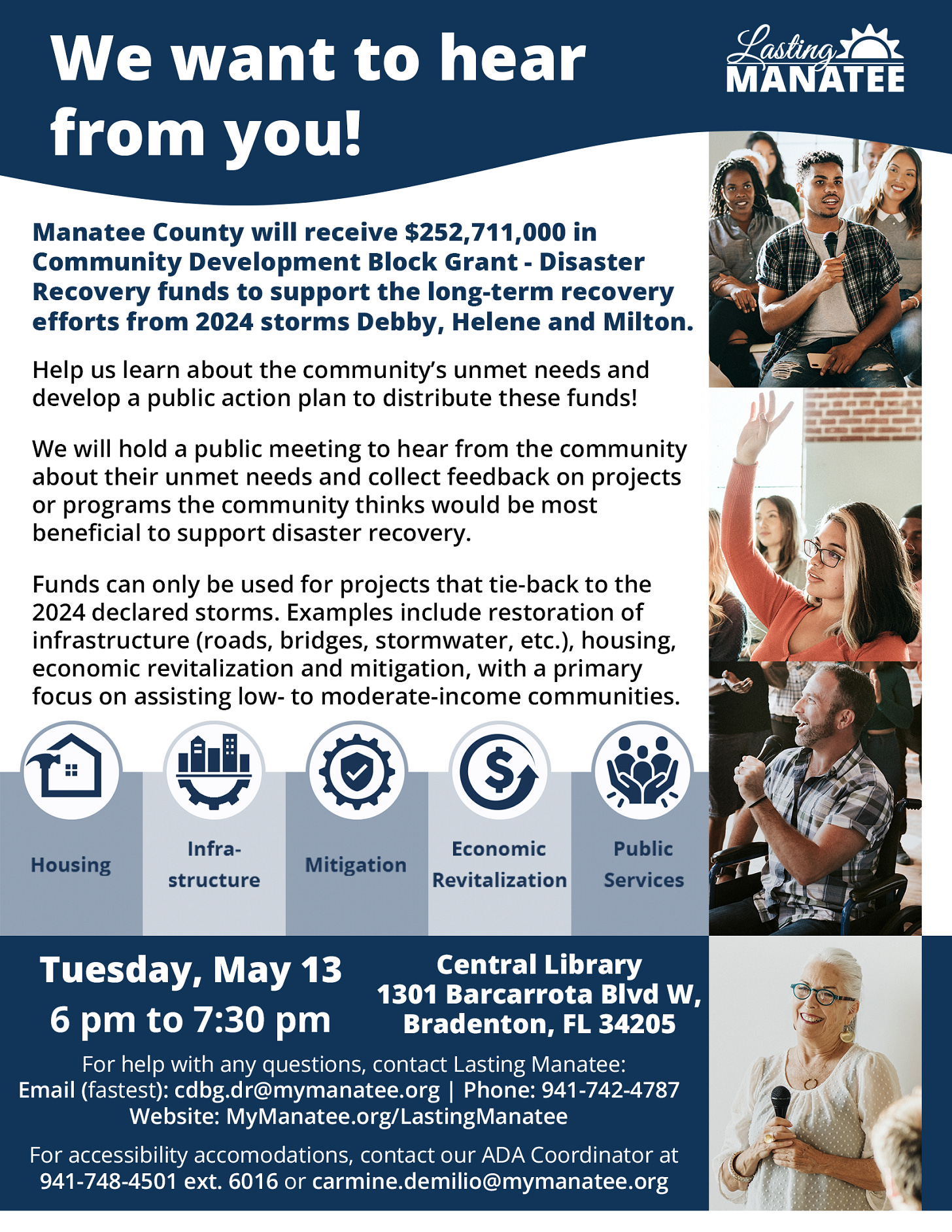Residents can learn more or submit questions by contacting Lasting Manatee at cdbg.dr@mymanatee.org or by calling 941-742-4787. Additional information is available online at MyManatee.org/LastingManatee.