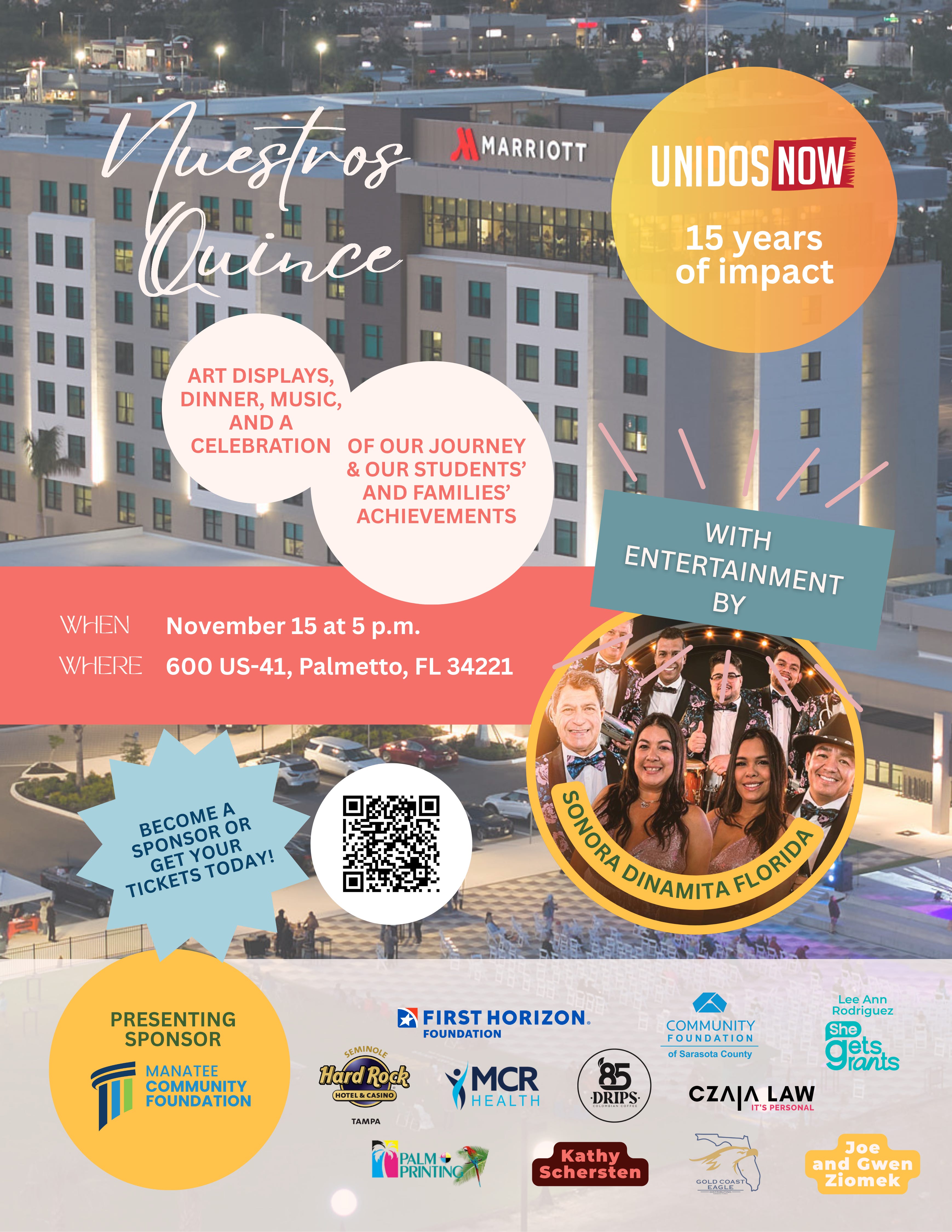 UnidosNow’s “Nuestros Quince: 15 Years of Impact” is a community celebration marking fifteen years of empowering first-generation, low-income Latino students and their families across the region. As a decisive leader in the organization’s success, former Executive Director Luz Corcuera has been invited as the honorary chair of the event.