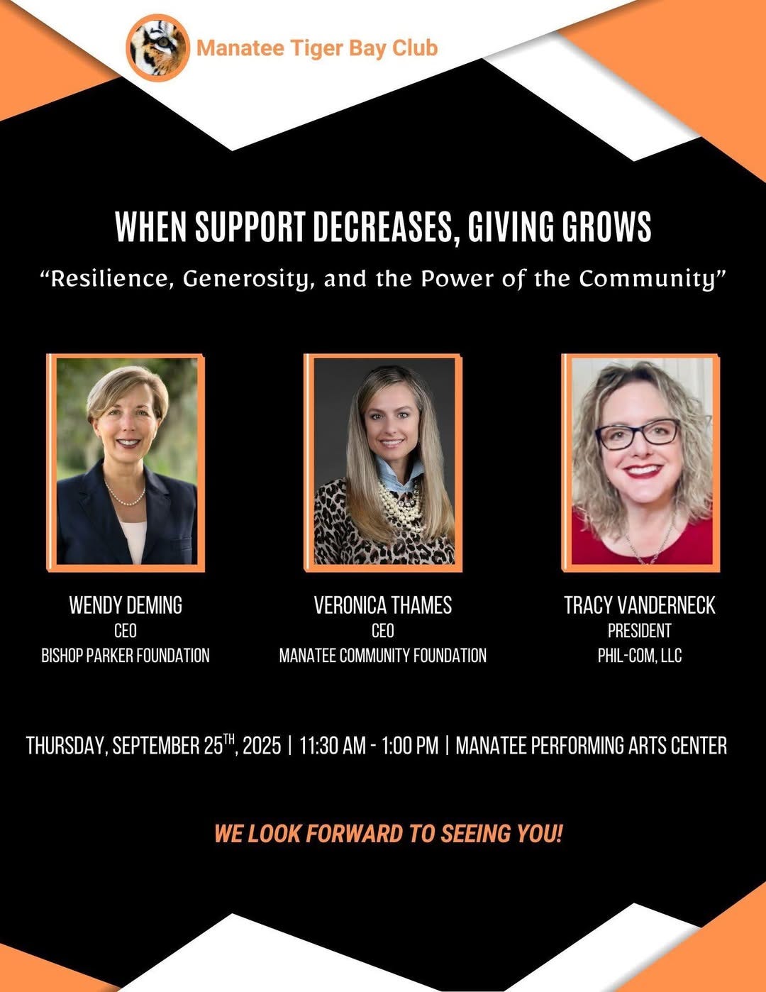 The Manatee Tiger Bay Club will host a timely discussion titled “When Support Decreases, Giving Grows” on Thursday, September 25, 2025, from 11:30 a.m. to 1:00 p.m. at the Manatee Performing Arts Center. The program will explore resilience, generosity, and the power of the community during times of financial challenge.