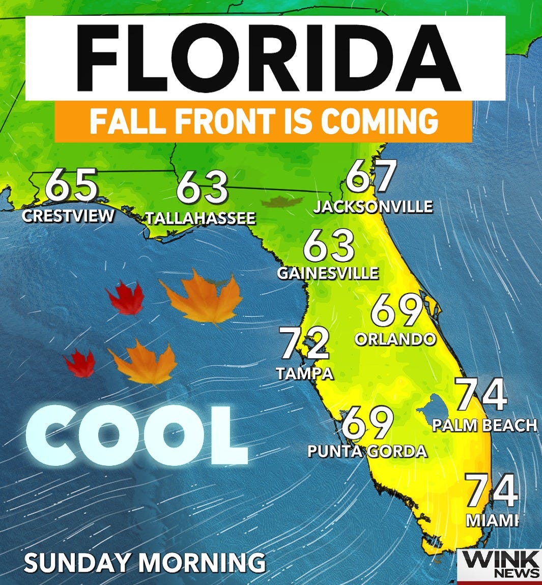 A welcome change in Florida’s weather is on the way as a front moves across the state, bringing cooler temperatures and lower humidity. By the weekend, many areas will experience a noticeable drop in morning lows, with parts of the state expected to dip into the 60s by Sunday.