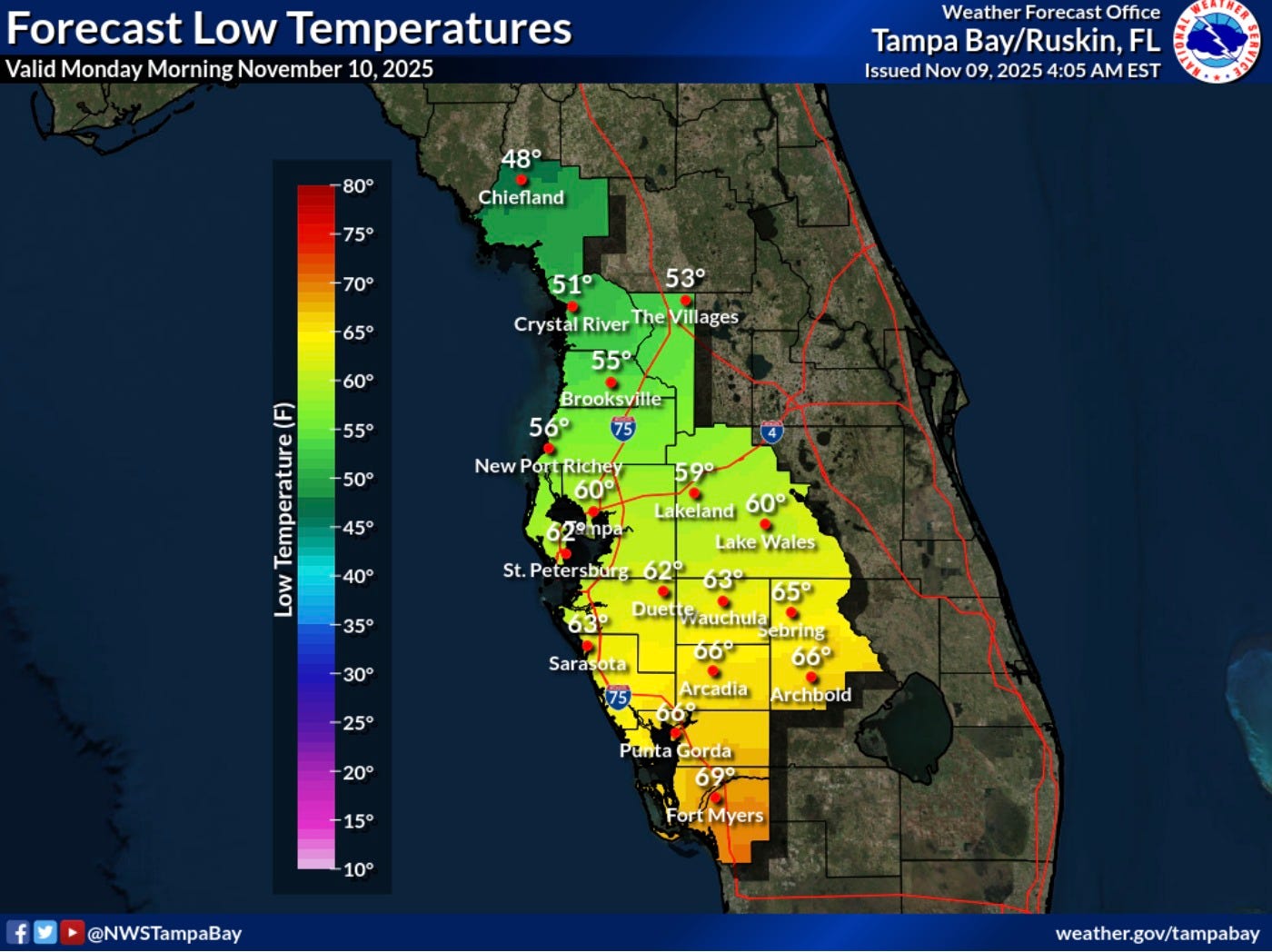 A cool front is sweeping through Manatee County early this week, bringing noticeably lower temperatures on Monday and Tuesday, according to the National Weather Service in Tampa Bay.