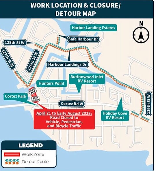 The closure between April 21 and early August 2025 affects access for vehicles, pedestrians, and cyclists in the work zone surrounding the Cortez Bridge, with detours clearly marked to reroute traffic around the area. The detour map includes adjustments for access to residential communities, businesses, and RV resorts such as Harbour Landings, Holiday Cove, and Buttonwood Inlet.