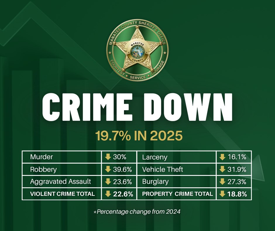 Overall crime in Manatee County fell 19.7% from 2024 to 2025, marking another significant decrease and continuing a downward trend in reported offenses.