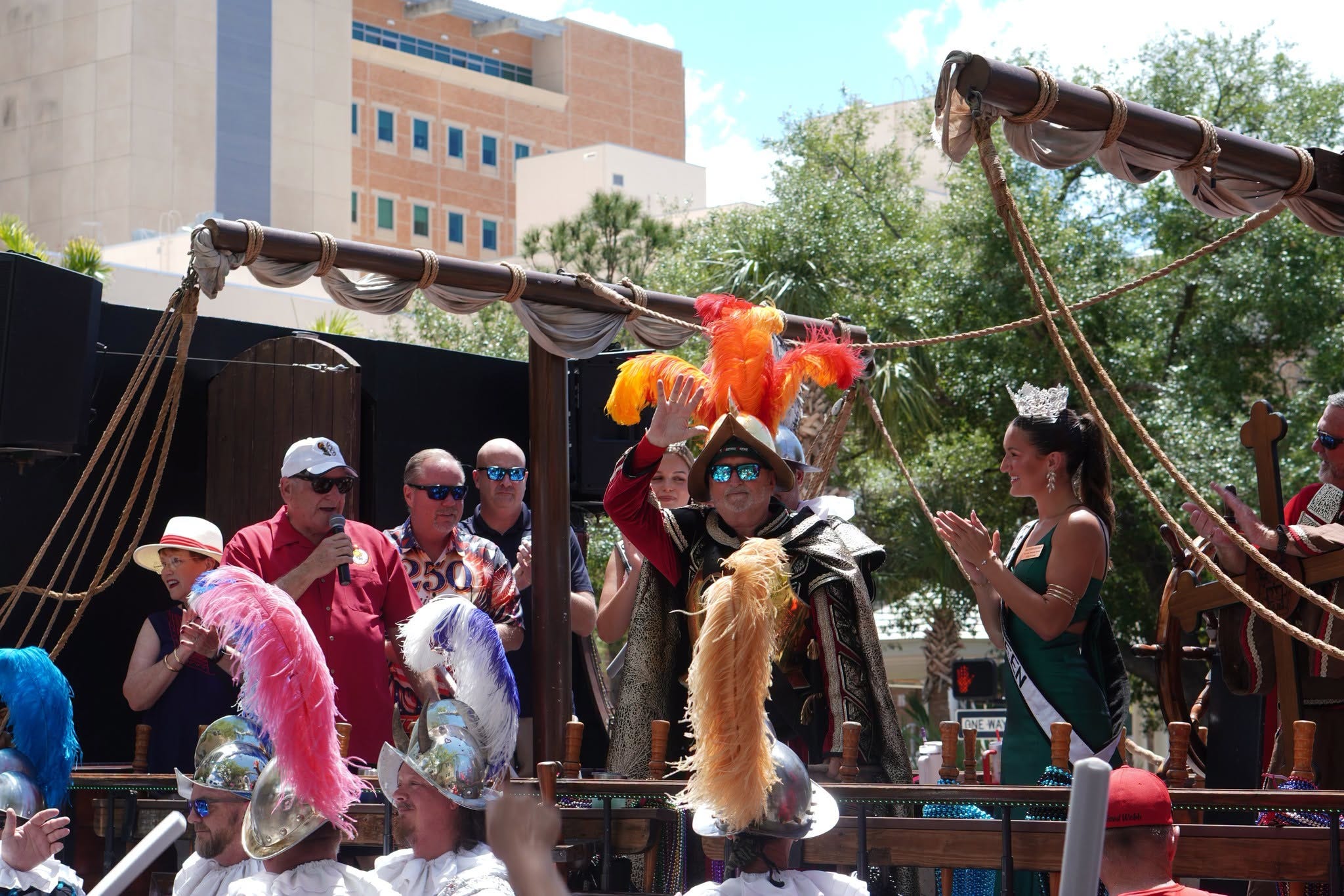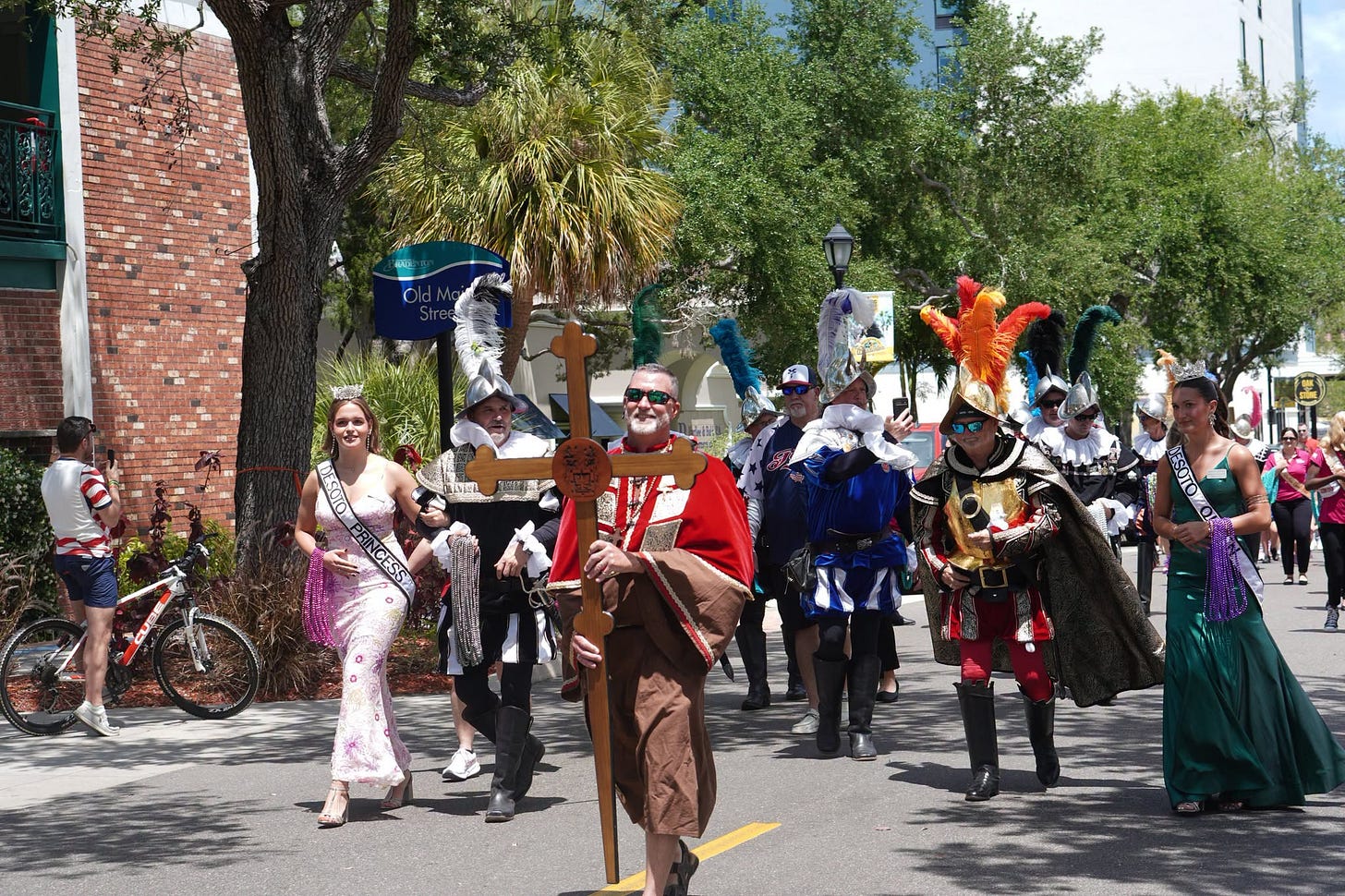 Led by Don Hernando de Soto and his Crewe, the Conquistadors marched up Main Street to cheering crowds, marking one of the most anticipated moments of the annual celebration. Families lined the streets as beads were tossed into the crowd, children waved foam swords, and the festive spirit transformed downtown into a lively scene of history and community pride.