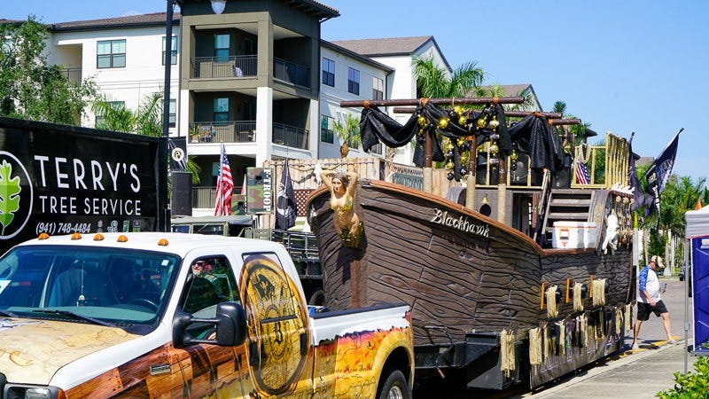 The celebration will begin earlier in the day with a downtown pre-party starting at 3:30 p.m., creating a festive atmosphere throughout the city as families, visitors, and community groups gather ahead of the main event. The Grand Parade will step off at 7:30 p.m., featuring brightly lit floats, marching groups, and community organizations participating in the long-standing Bradenton tradition.
