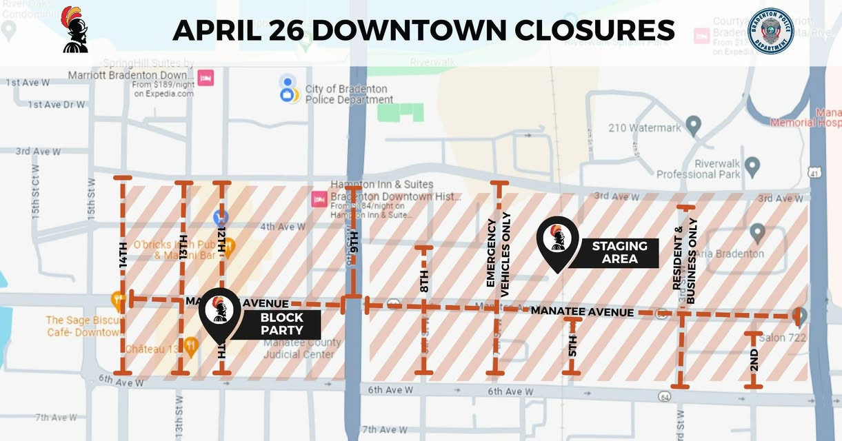 Manatee Avenue W will close from 1st Street W (US-41) to 14th Street W.1:00 p.m.: