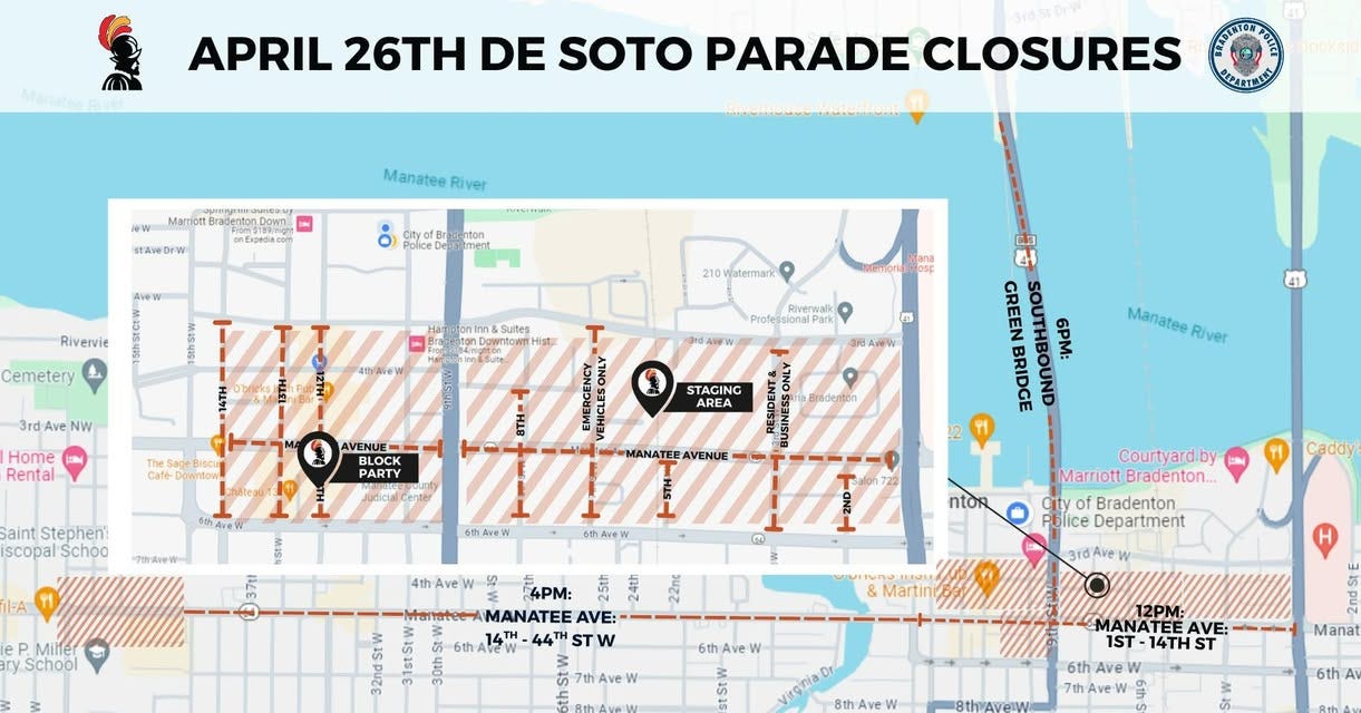 The parade begins at 14th Street W and ends at 39th Street W, with thousands of attendees expected to line the route. A full list of closures and updates can be found at bradentonpd.com/newsreleases/2025desotoparade.