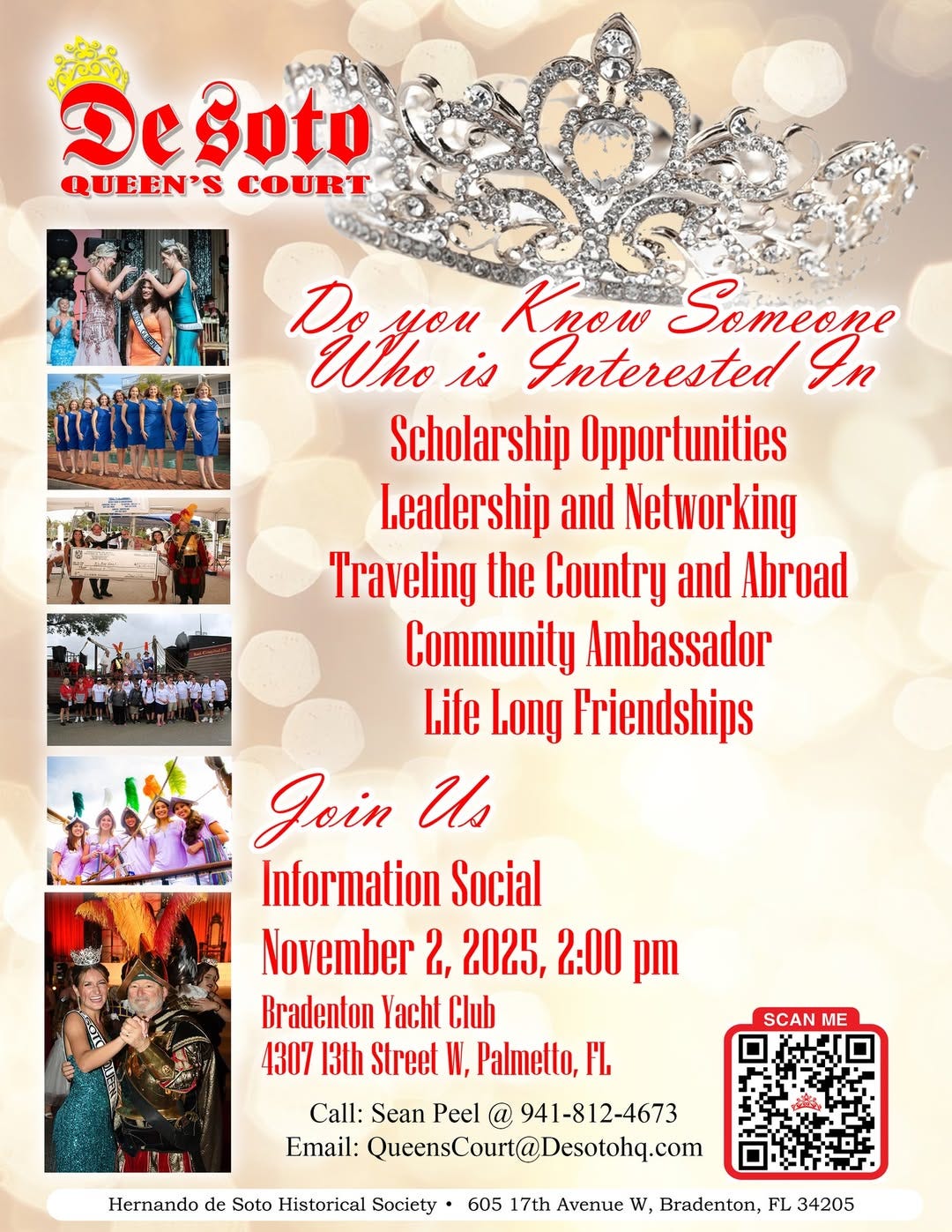 The Hernando de Soto Historical Society will host an informational social for the De Soto Queen’s Court on Sunday, November 2, 2025, at 2:00 p.m. at the Bradenton Yacht Club, located at 4307 13th Street West in Palmetto.
