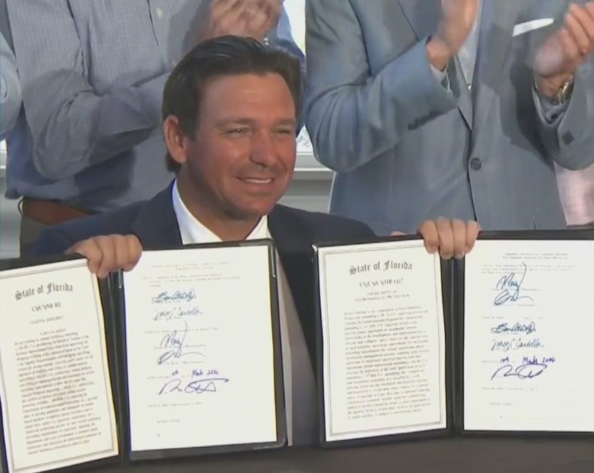 Florida Gov. Ron DeSantis signed two pieces of legislation Thursday in Manatee County that will impact coastal development, environmental policy, and local infrastructure, including a measure that effectively halts a proposed cruise terminal near the Sunshine Skyway Bridge.