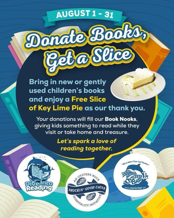 Throughout the month of August, participating locations of Anna Maria Oyster Bar are offering a sweet reward for a generous act. From August 1 through August 31, guests who donate new or gently used children’s books will receive a free slice of Key Lime Pie as a thank-you — all part of a community-wide effort to promote childhood literacy.