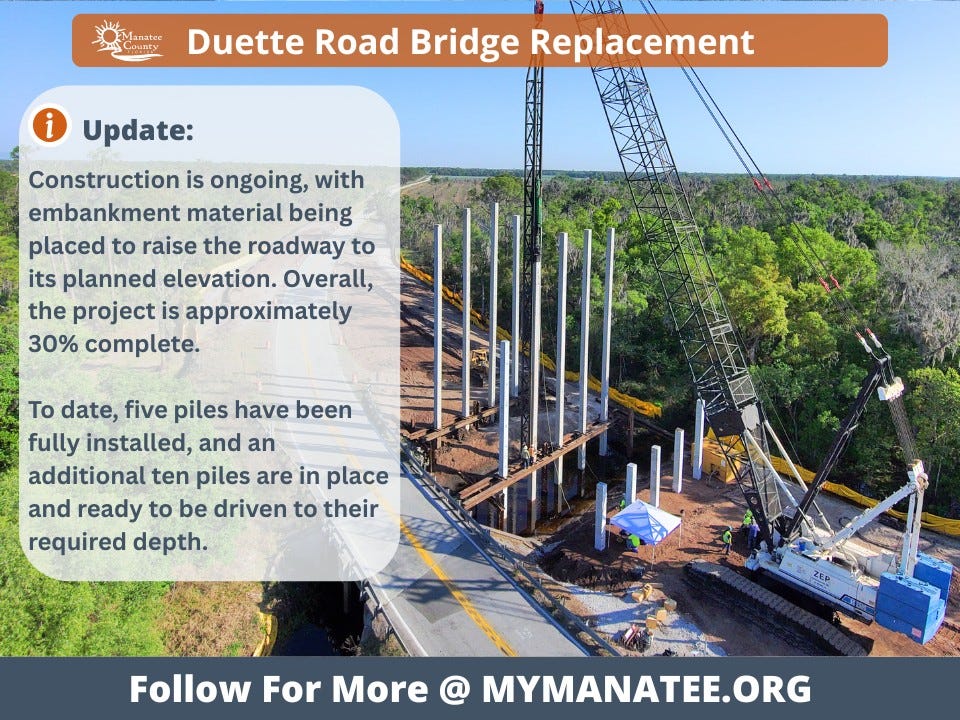 Construction continues on the Duette Road Bridge replacement project, with crews actively elevating the roadway and installing foundation supports as part of the ongoing infrastructure improvement.
