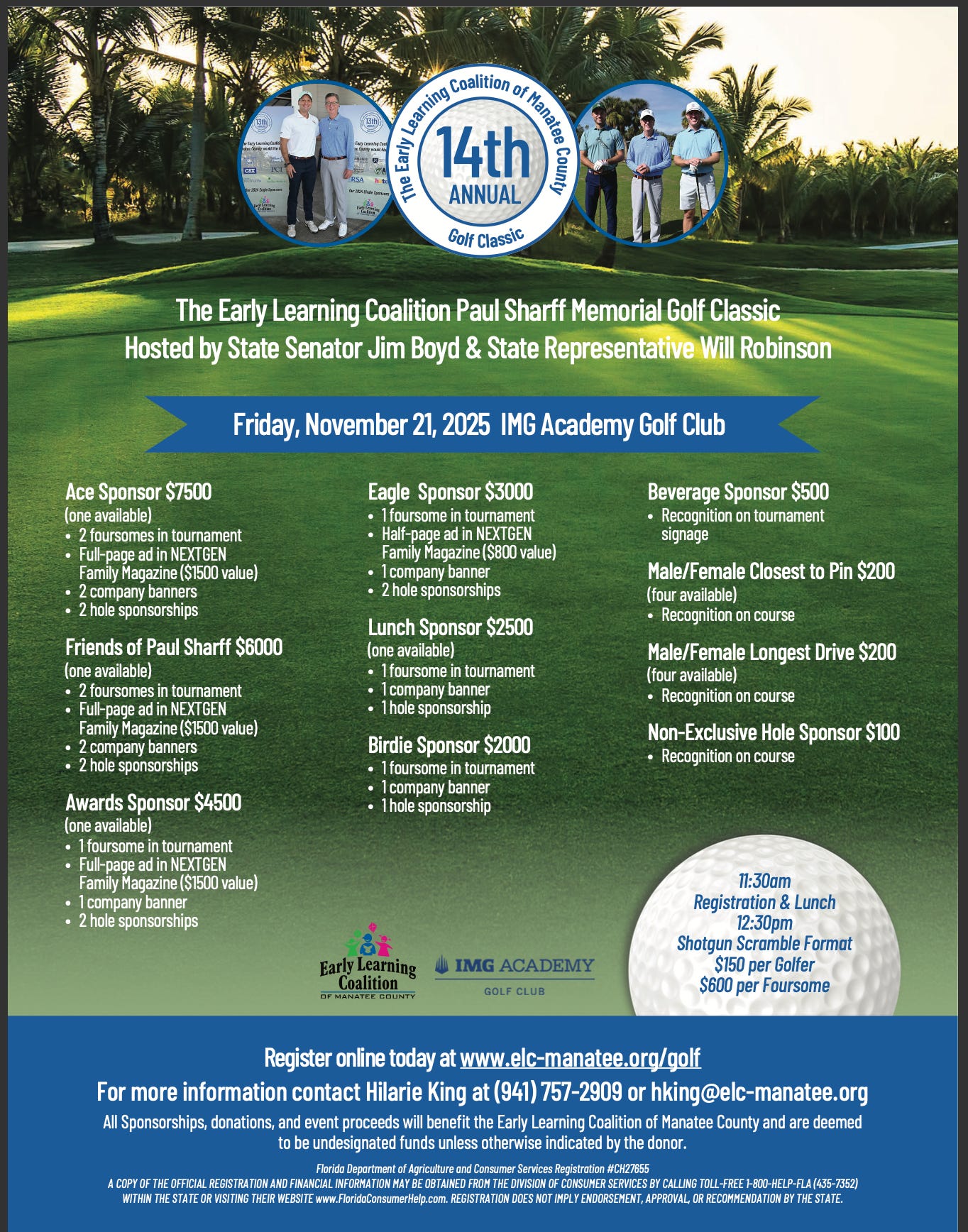 For registration or sponsorship details, visit www.elc-manatee.org/golf or contact Hilarie King at hking@elc-manatee.org.