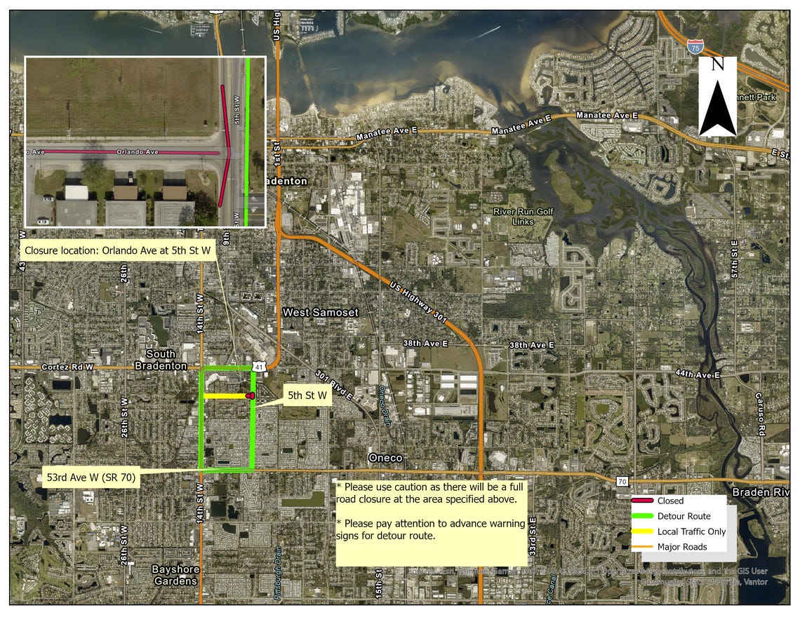 The east end of Orlando Avenue at Fifth Street West in Bradenton will close for approximately one month as crews complete infrastructure improvements tied to a new affordable housing development.