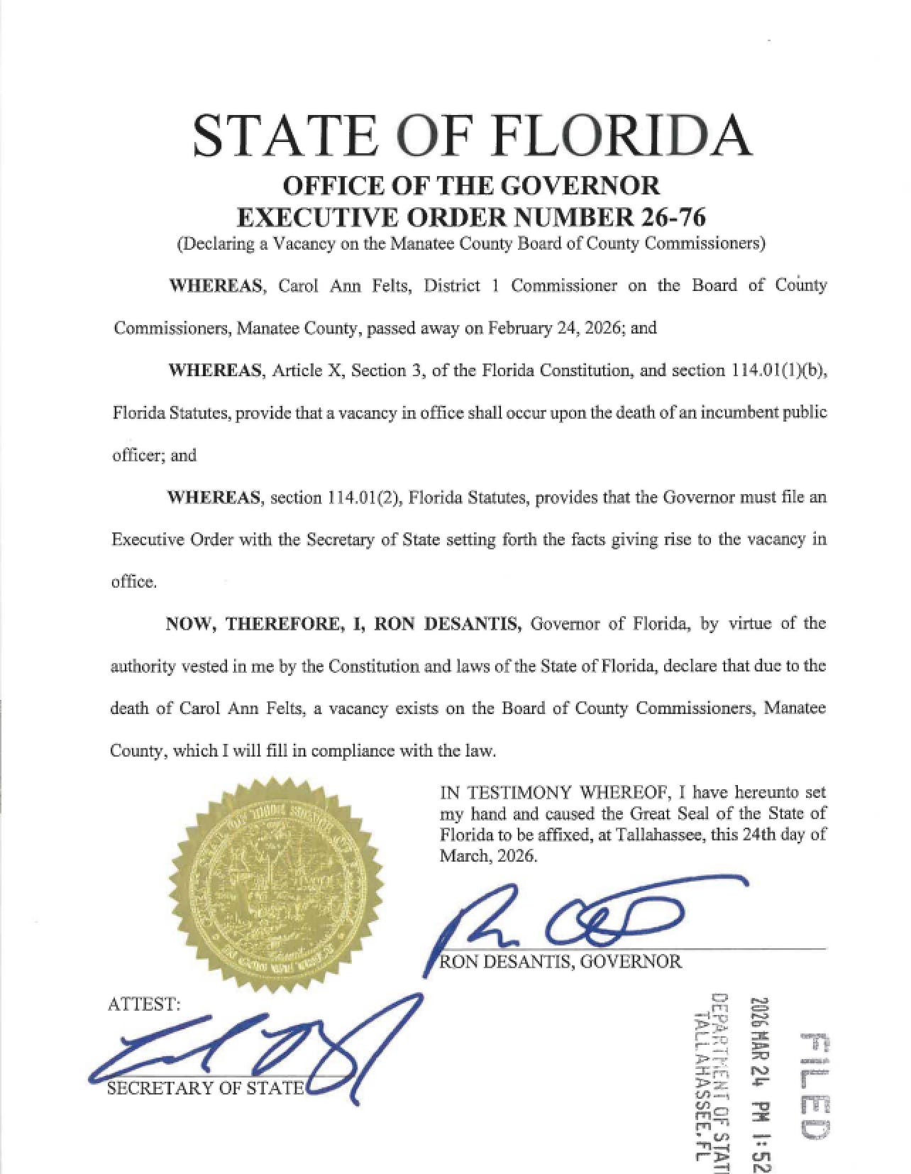 Florida Governor Ron DeSantis has issued Executive Order 26-76, formally declaring a vacancy on the Manatee County Board of County Commissioners following the death of District 1 Commissioner Carol Ann Felts on February 24, 2026.